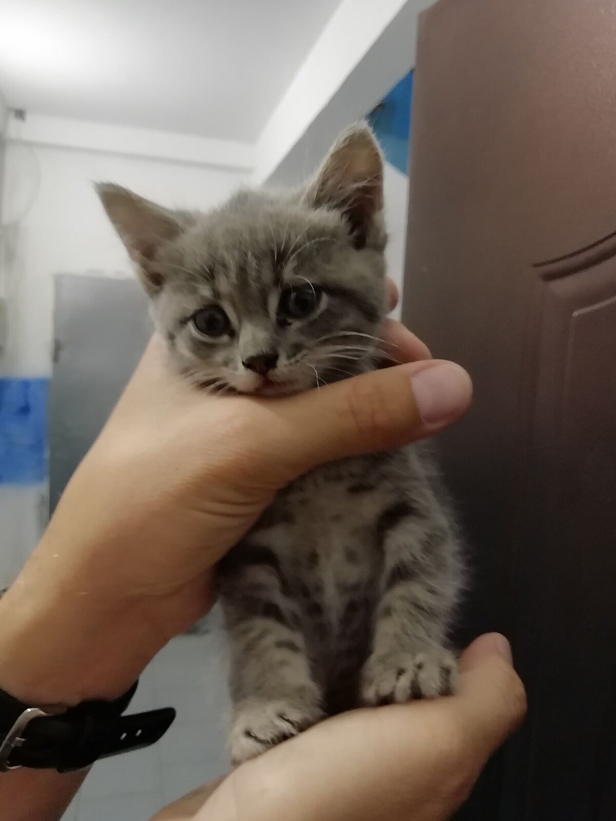 На вид котику до 1 месяца, чистенький, без запаха, глазки тоже чистые)) покормили, напоили, но оставить у себя не могу((есть кошка, которая шипит и кидается на него((
