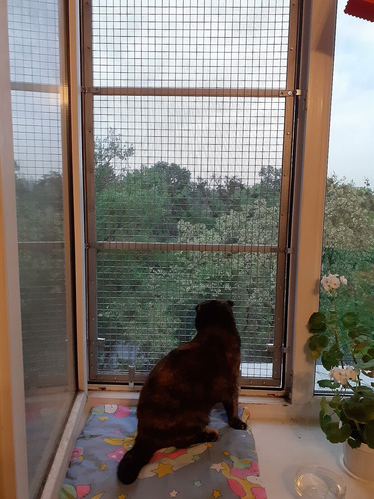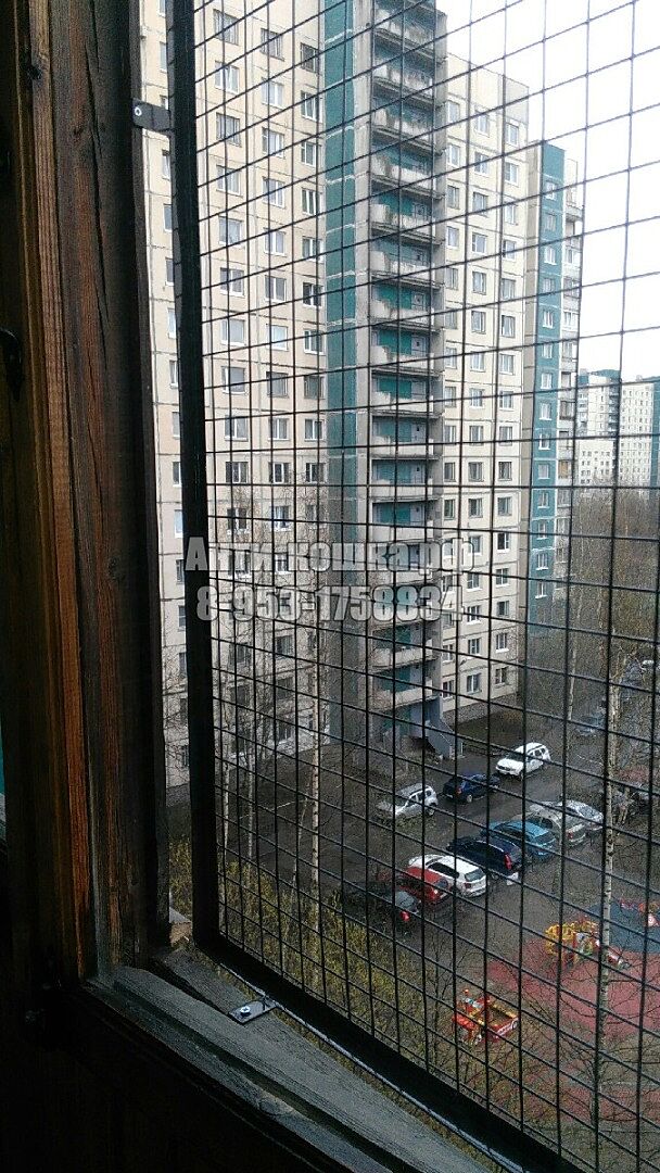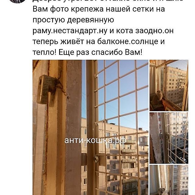 Вот варианты антикошки на Ваше окно. Если Вы или муж с руками, то делается она очень просто. Рама из деревянного бруса, собирается на уголки. На нее снаружи прикручивается вольерная оцинкованная решетка с ячейкой 2,5х2,5см и толщиной проволоки около 1-1,4мм. Решетку можно к дереву прижать алюминиевой полосой. Или оконными уголками по углам, потом такие же уголки сломать на 2 части, и посередине. На раму можно вешать, как на фото. можно на петлях с одной стороны и на шпингалетах с другой.