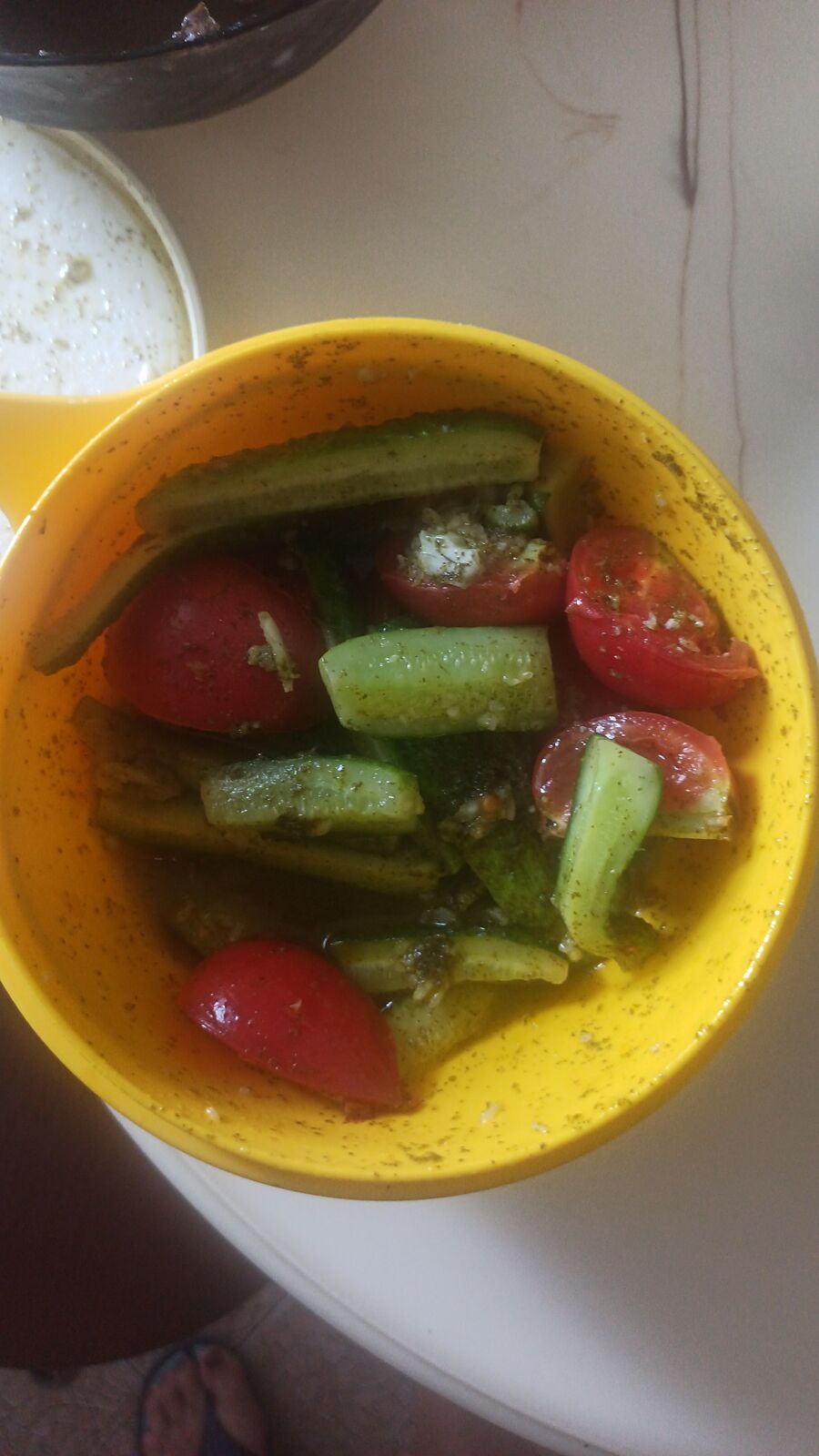 3. Салат с помидорами, зеленью (сегодня использовала пукколлу и базилик) и чесноком свежим, заправленный домашним или оливковым маслом и бальзамическим соевым соусом. Иногда без помидоров и чеснока, а просто с разной зеленью.
