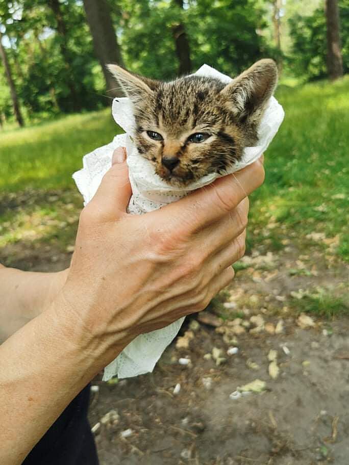 Моя мама нашла в лесу. Гулять пошли и нашла случайно. Совсем истощенный был и обезвожен. Пару месяцев дома живет.