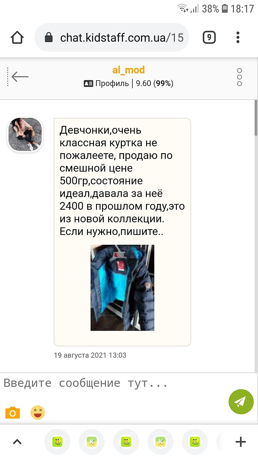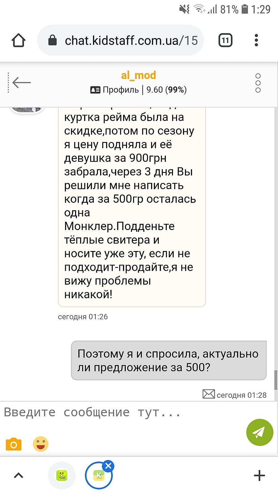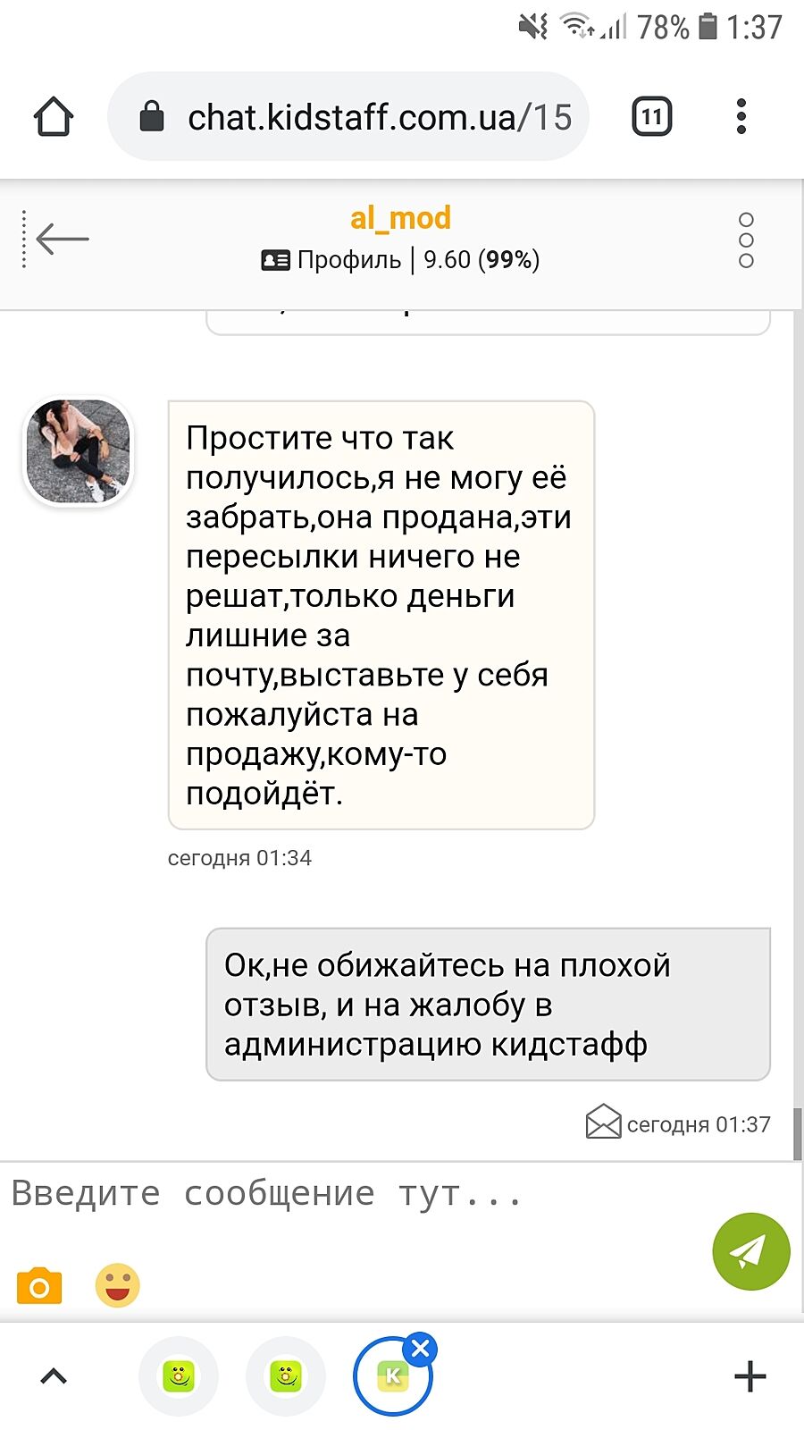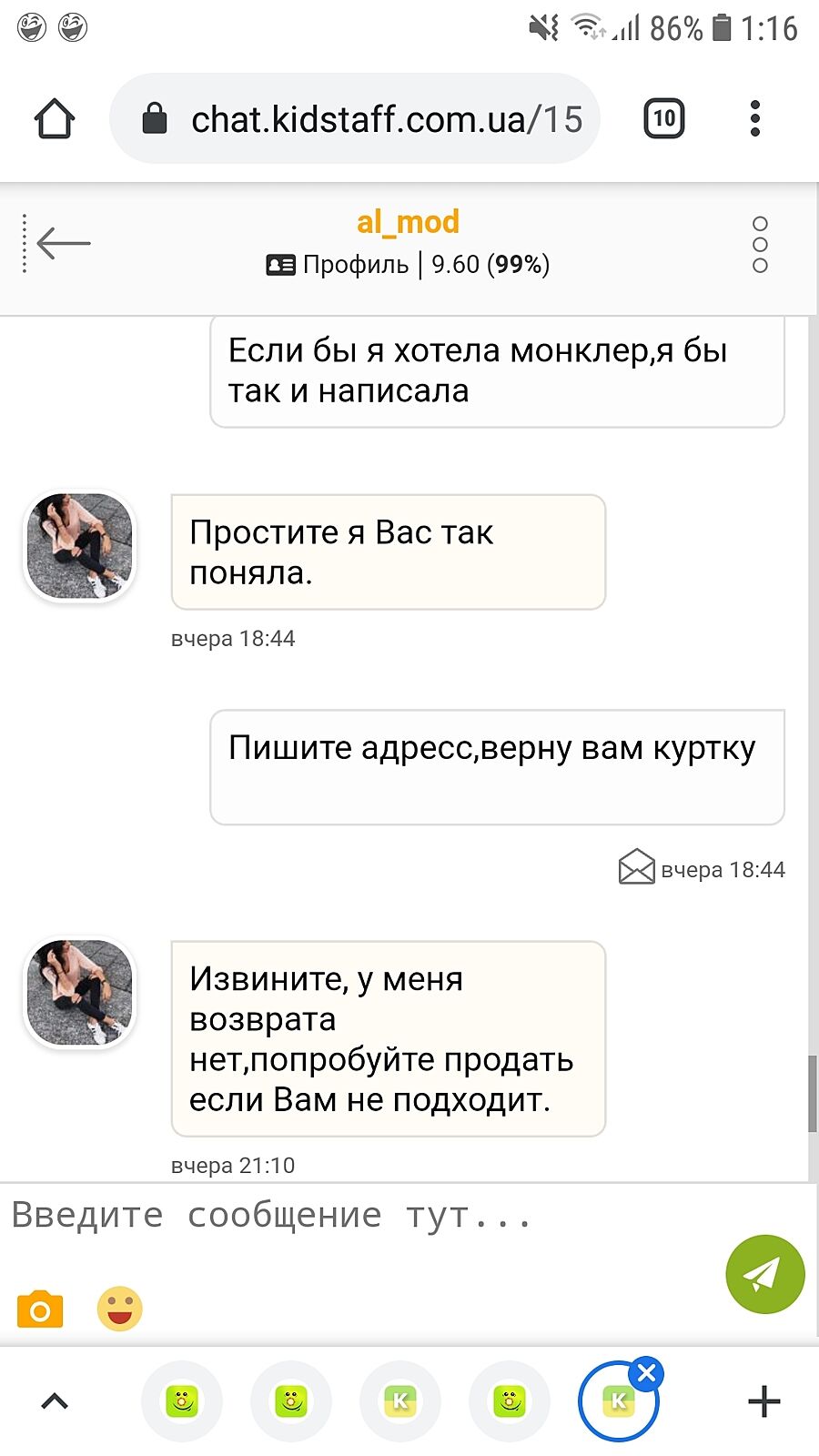 Опять стопятцотая тема про заказы на кидстафф)) была подиска на куртки,и тут прилетает мне сообщение, берите за 500(была она за 900). Заметила смс через неделю, смотрю обьява активна, пишу в личку продавцу-актуально ли за 500? Продавец пишет да, я плачу, она отправляет,и мне приходит другая куртка! Она перепутала! Возврат делать не хочет,ибо его у него нет! Я написала гневный отзыв,предупредив ее, и забила)а она обиделась)Кто и прав?