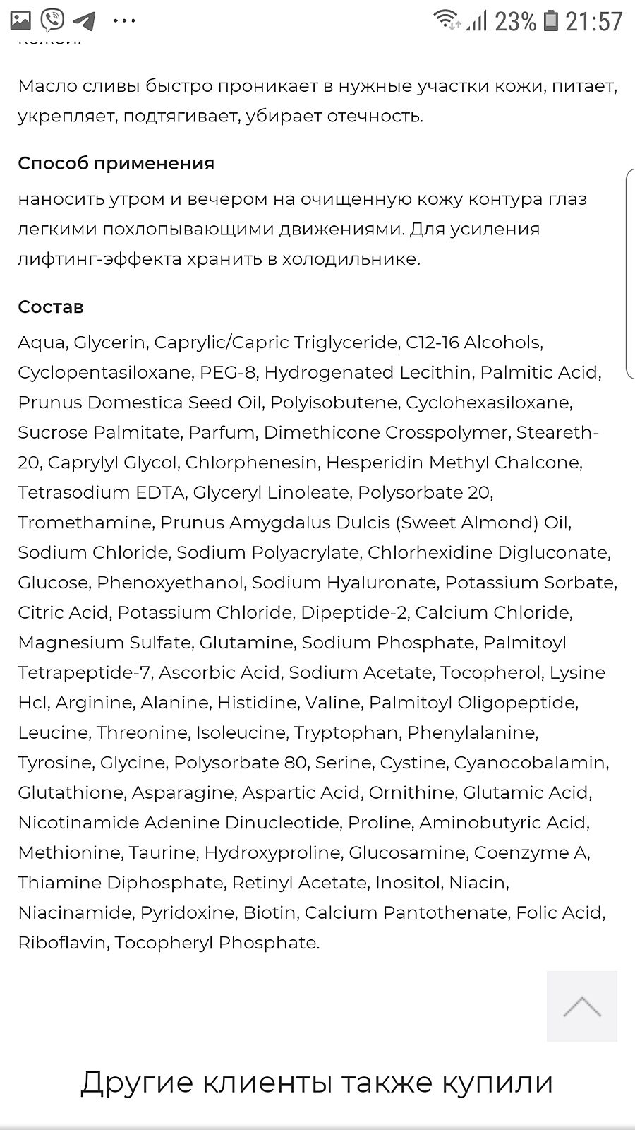 Девочки, что то у меня кожа под нижним веком с внутренней стороны стала какая-то тонкая и обезвоживаная. С внешней идеально, но там я подкалываю диспорт раз в 8-10 месяцев.Посмотрите пожалуйста состав, этот увлажнит?Девочки, спасибо заранее!