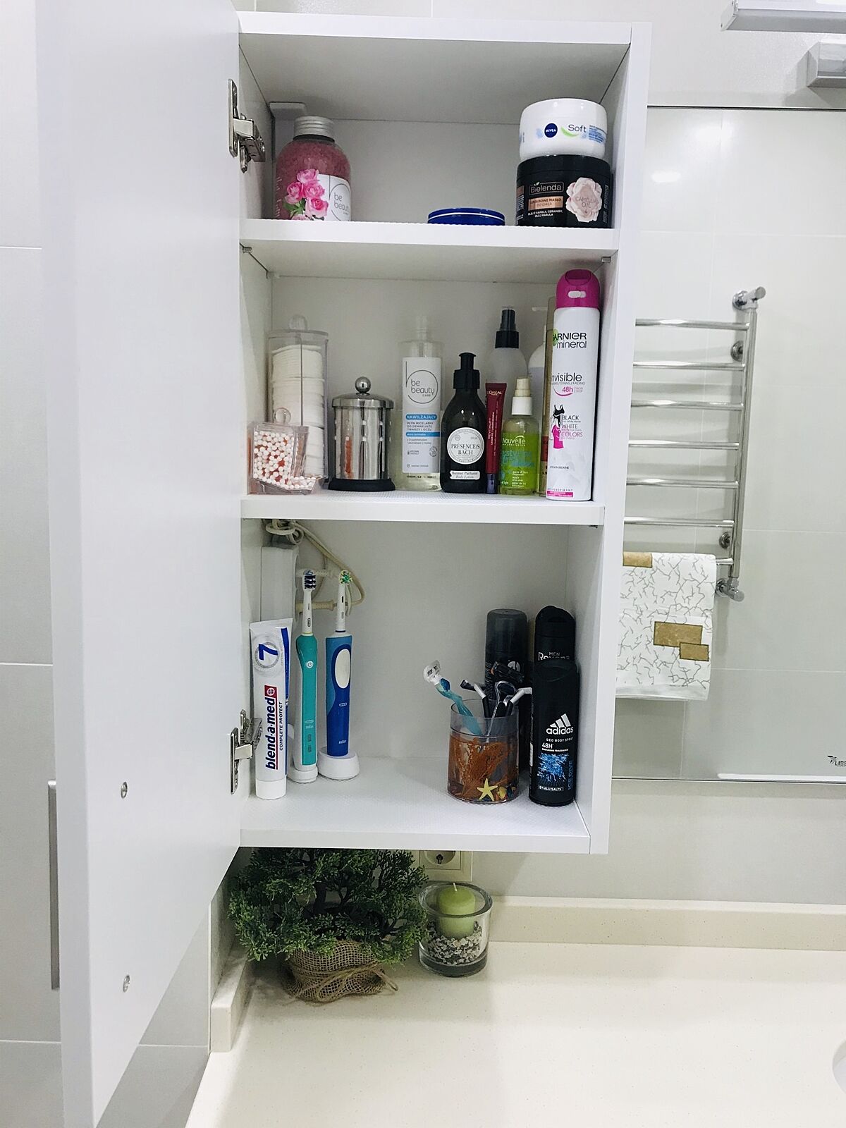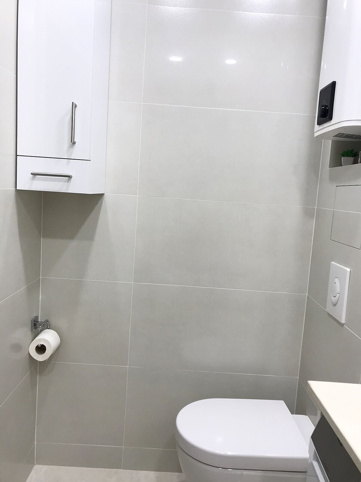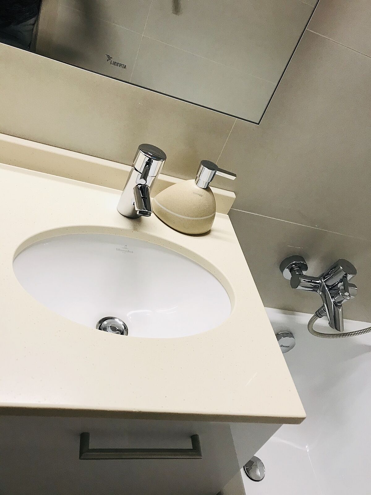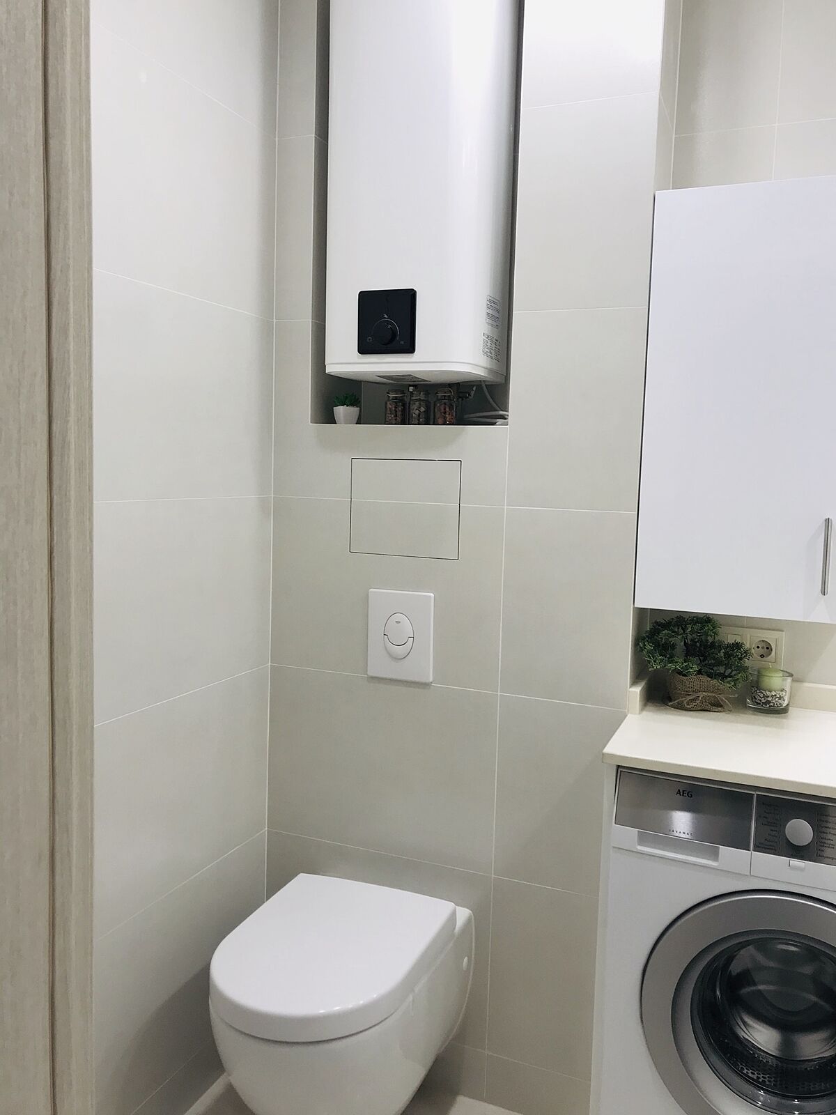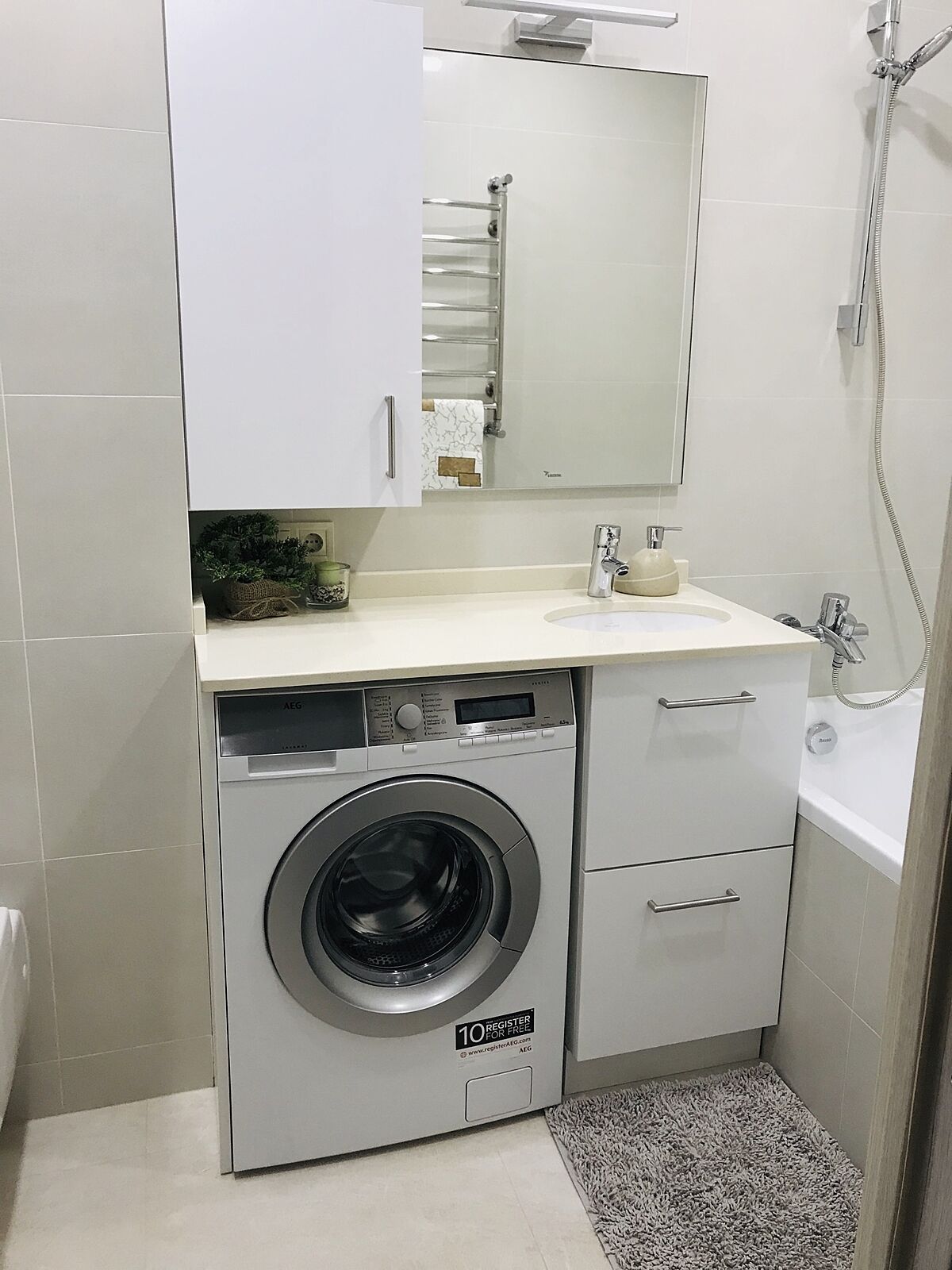 Напишу по памяти, сейчас не дома. Длина кварцевой столешницы 110 см, стиралка стандарт шириной 60 см, но узкая 45 см( специально искала такую)+ по 1-2 см зазоры по бокам и над столешницей. Умывальник Виллерой шириной 45 см встроенный снизу столешницы. Ванна Равак классик 150 см , выбирала самую глубокую. В коробе на углу, где бойлер трубы. Бойлер Атлантик 50 л, выбирала прямоугольный компактный, чтобы не биться головой, когда встаёшь с унитаза. Найду еще фото- скину Вам. В шкафчике розетка для зубной электрощетки.