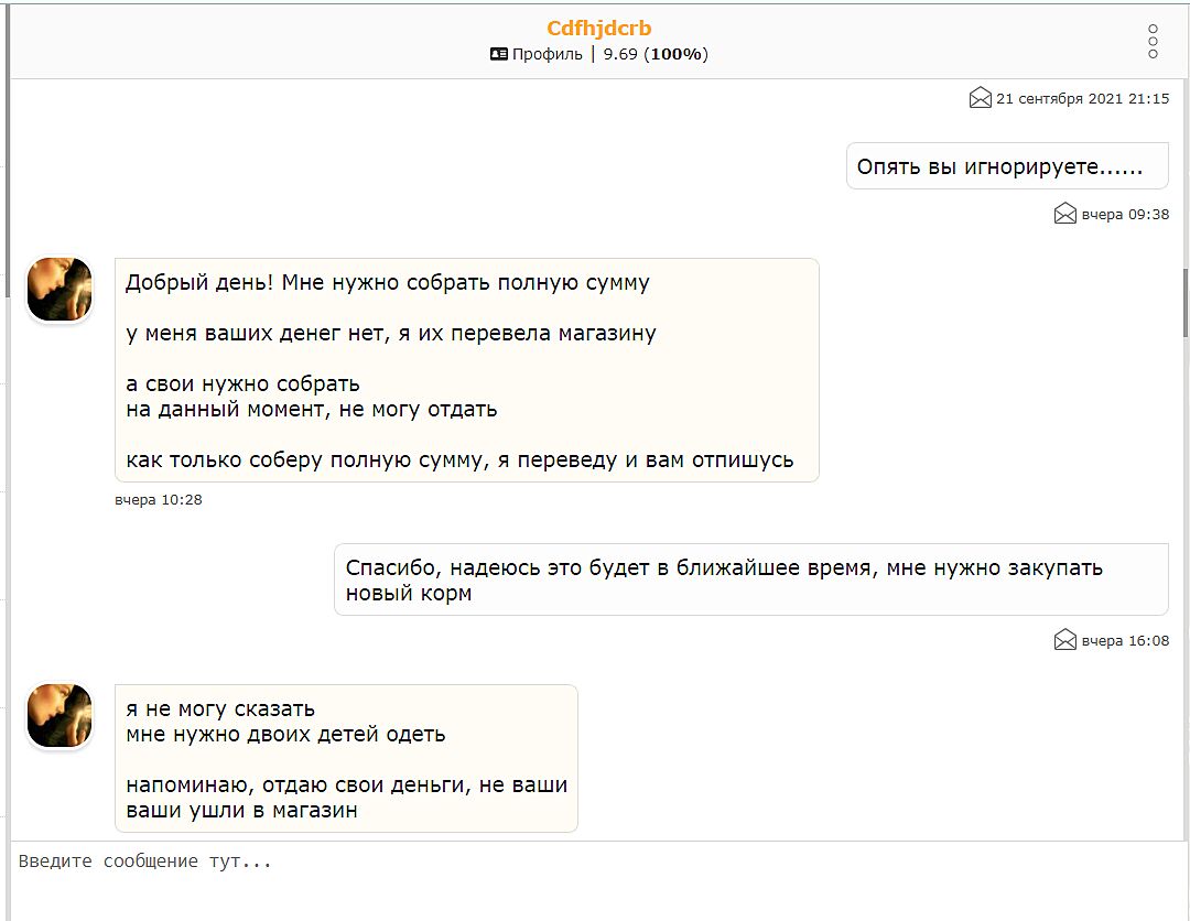 Капец автор. По сообщениям было видно,что она деньги не хочет возвращать. Эта баба еще не осознала,что она мошенница.