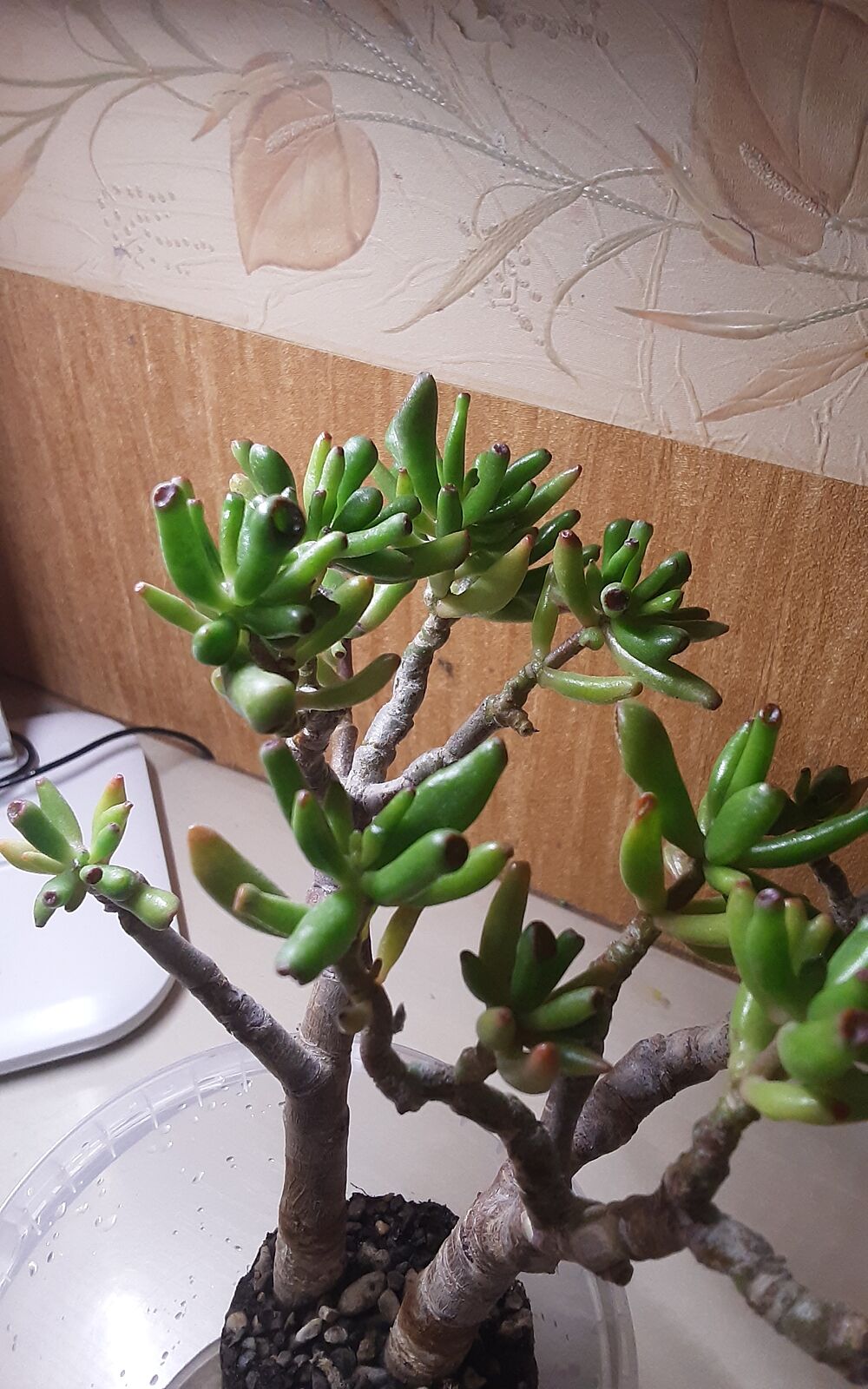 Очень люблю крассулу Голлум за листья в форме «ушек Шрека» — трубчатые, с воронкообразными кончиками: