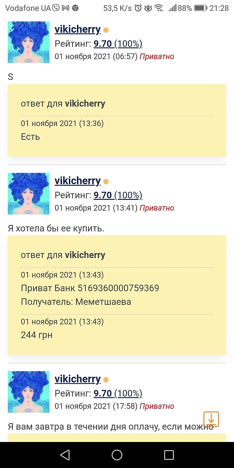 Девочки, за 9 лет на Килстаффе такое впервые. По-моему на мошенника я напоролась. Скрины переписки предоставлю, сумма небольшая, конечно 244 грн. Но вот в чем вопрос, рейтинг хороший у продавца, ниодного отрицательного отщыва. В покупатели добавила, давно на сайте. Я и подумать не могла, что после оплаты она удалит просто сообщение неотвечая мне. Это что 244 грн не хватало в жизни? Написала админам, может разъяснят что-то. Может с ней что-то случилось и палец сам нажал удалить сообщение. Это и насторожило... Надеюсь я неправа.