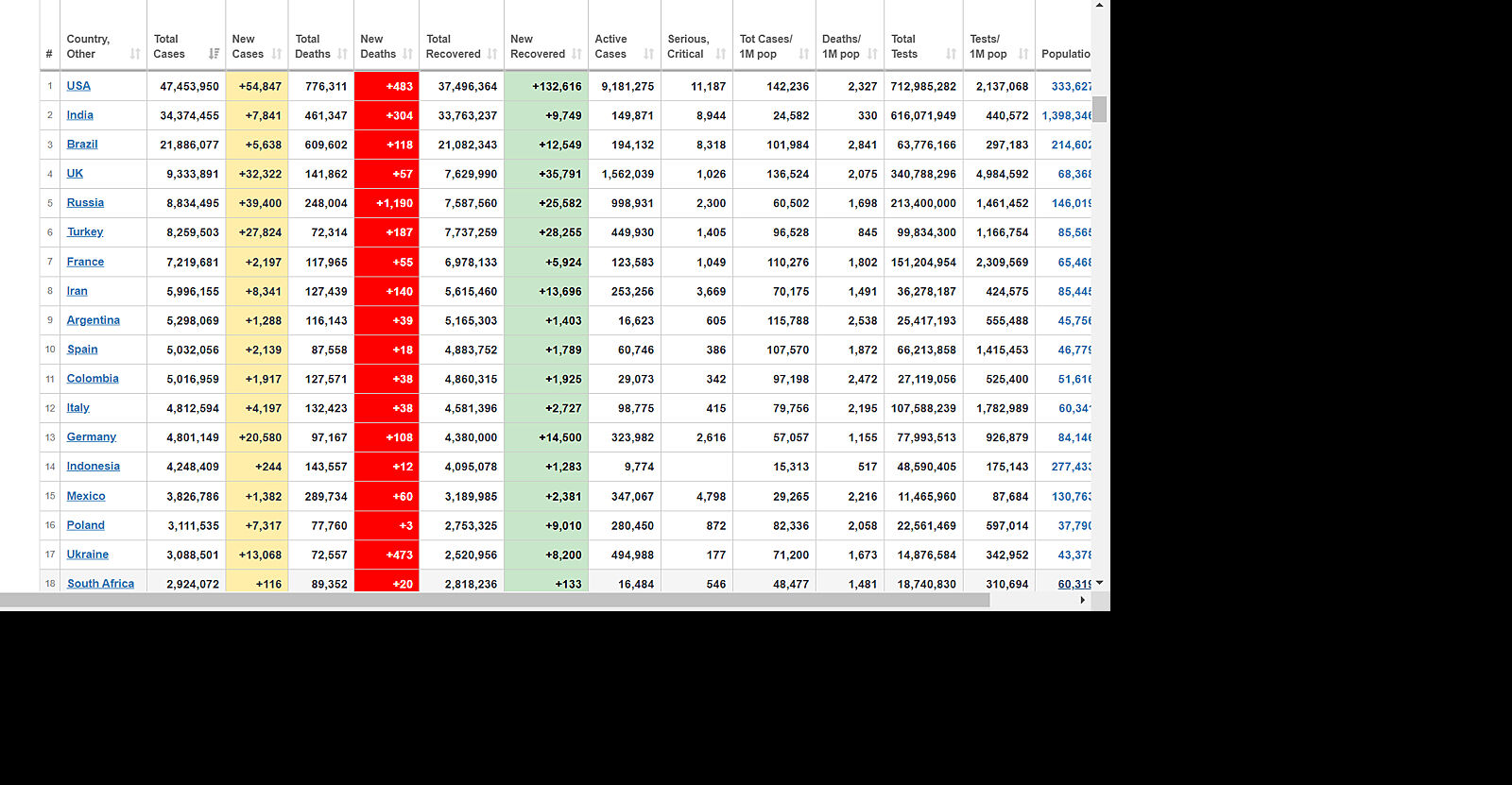 Ну вот смотрю - за вчера.... Страны Европы вообще неплохо по смертности, особенно UK. В США - 483 смерти, при населении 333,6 млн., в России - 1190 смертей, при населении 146 млн. и в Украине - 473 смерти, при населении в 43.3 млн.(по таблице). Если посмотреть смерти, к количеству населения, то у нас даже хуже, чем в России...((