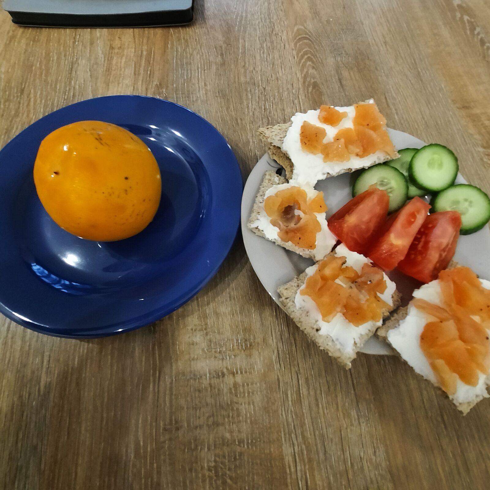 Это красная рыбка? У меня такой завтрак был, только вместо хурма мандарин и кофе с одной шоколадной конфеткой)))