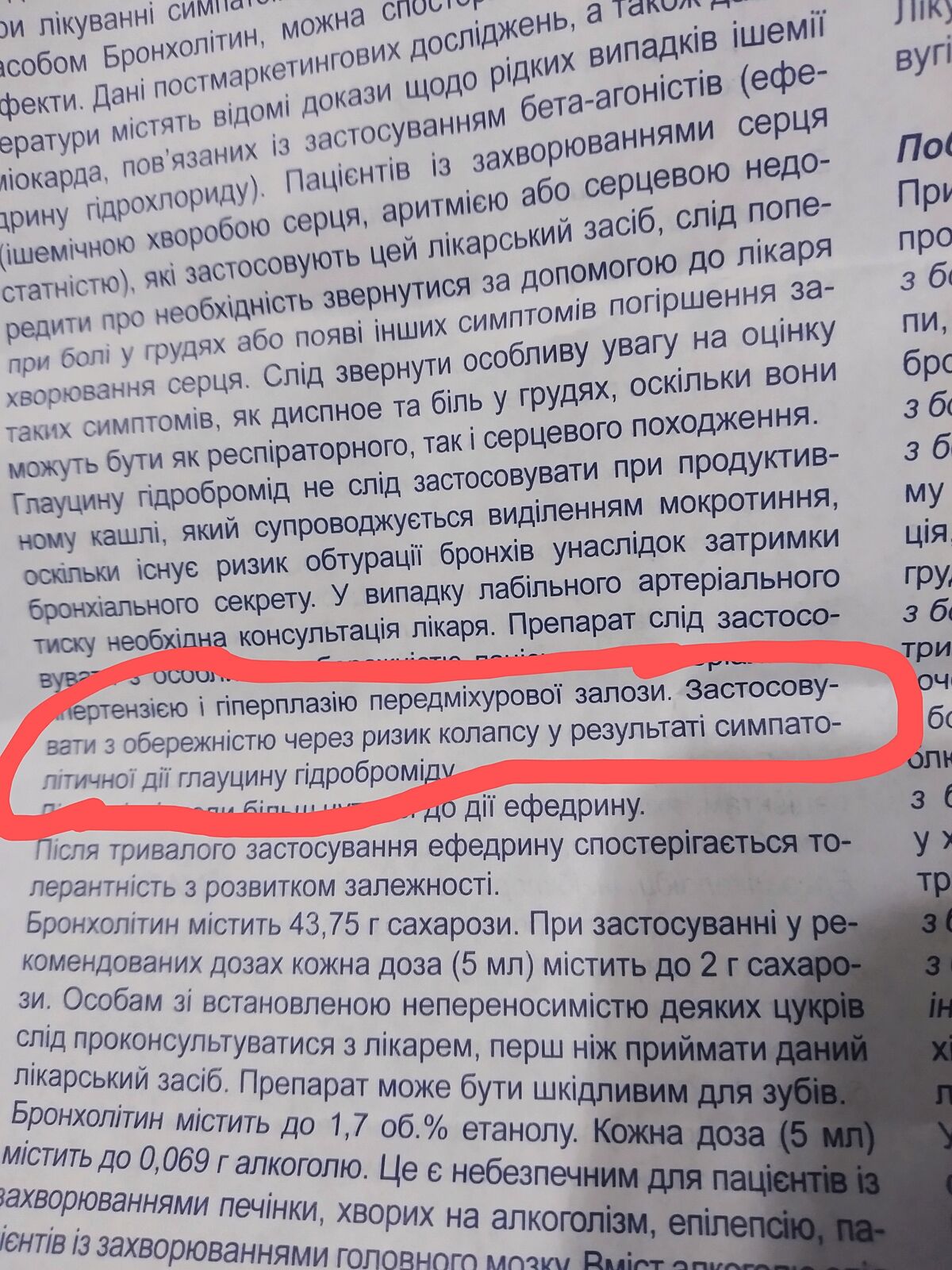 Да, я боюсь , что бы не было как у вашей знакомой(((( а почему бронхит лечится в основном аб, если бронхит вирусный например? И вся клиника типичная вирусная? Мне не виднее, просто хочу разобраться. Бронхолитин я отменила, так как есть противопоказания! Мне рисковать жизнью? Я думала это какой то лёгкий препарат без особых противопоказаний и побочек.. прочитала инструкцию и это капец((( чего только стоит фраза ’застосовувати з обережнистю, через ризик коллапсу у результати симпатолитичнои дии глауцину гидробромиду’ То есть летальный исход!! Ну, как это вообще? Это безопасный препарат?? Тем более принимать его вместе с эрдостеином, неизвестно какой будет эффект!