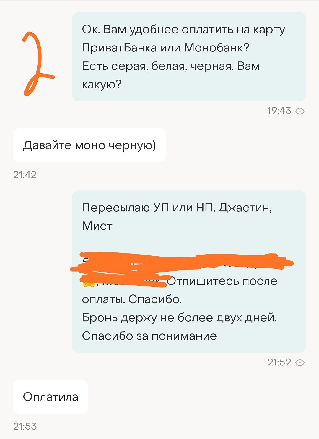 Я поняла что покупатель выбрал черную шапку и оплату на карту моно