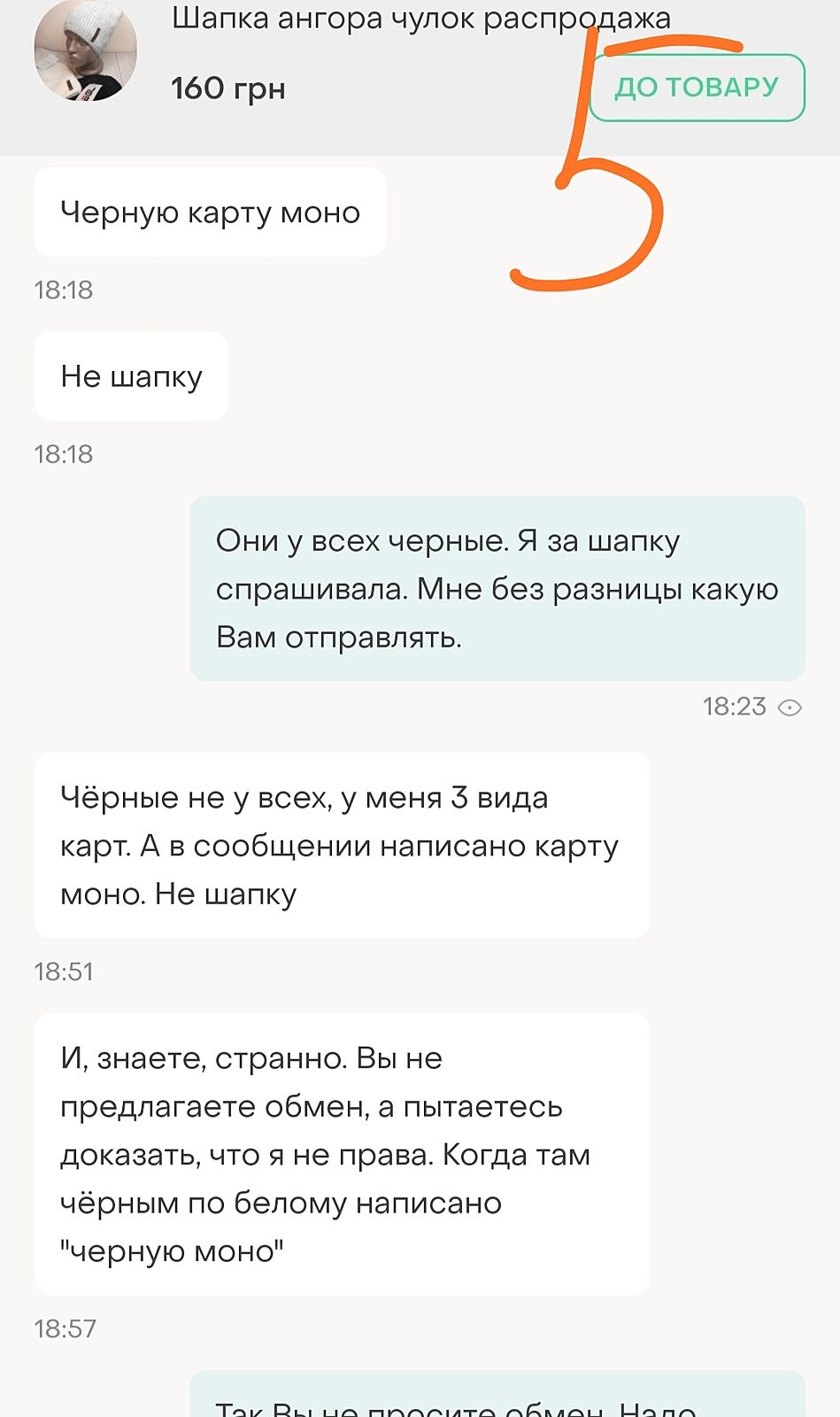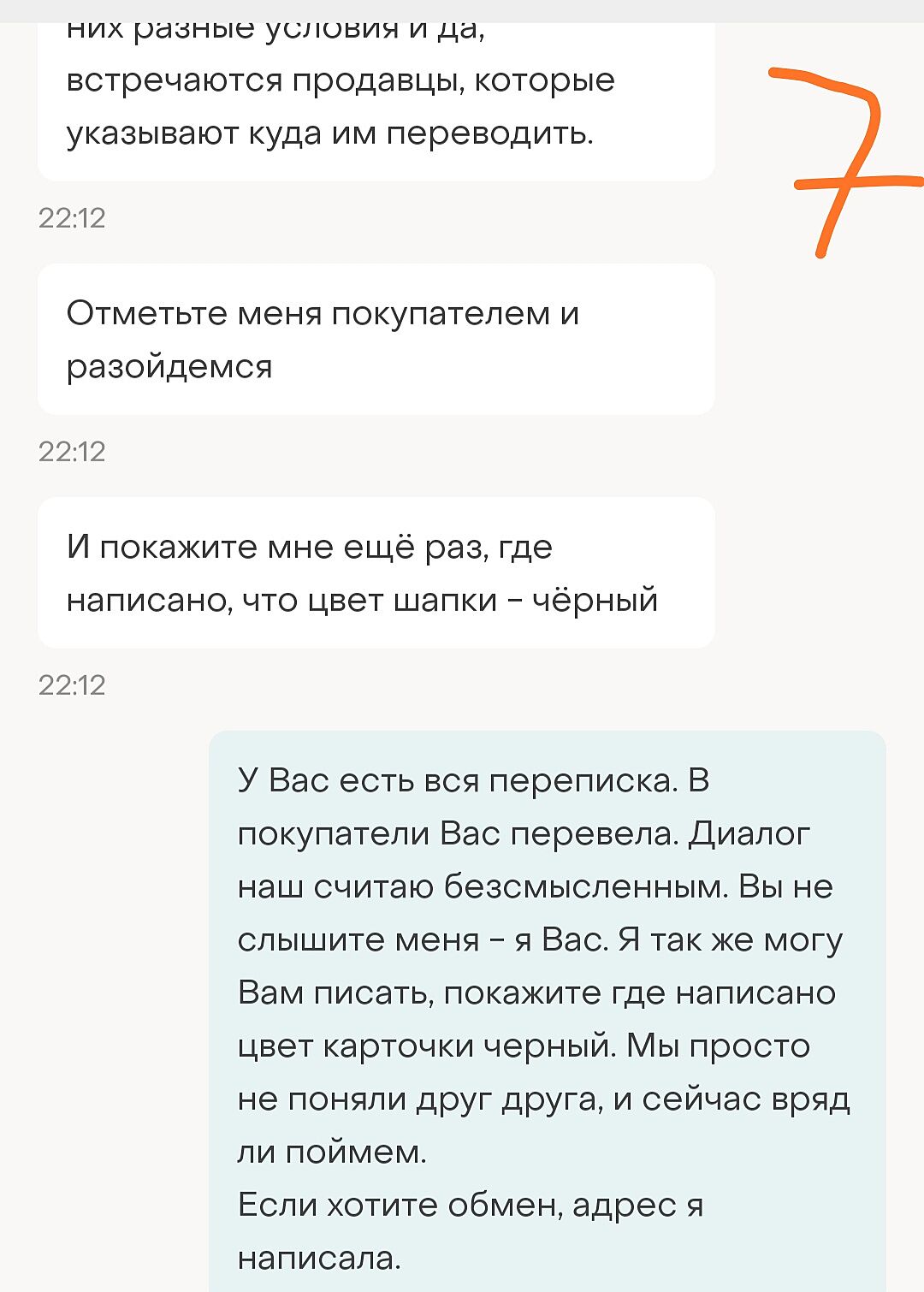 На всякий случай, после оплаты, нужно было продавцу еще раз задать уточняющий вопрос покупателю о цвете шапки( в объявлении их 3), например : ’ шапку отправлять чёрную?’, тогда бы не было этой ситуации