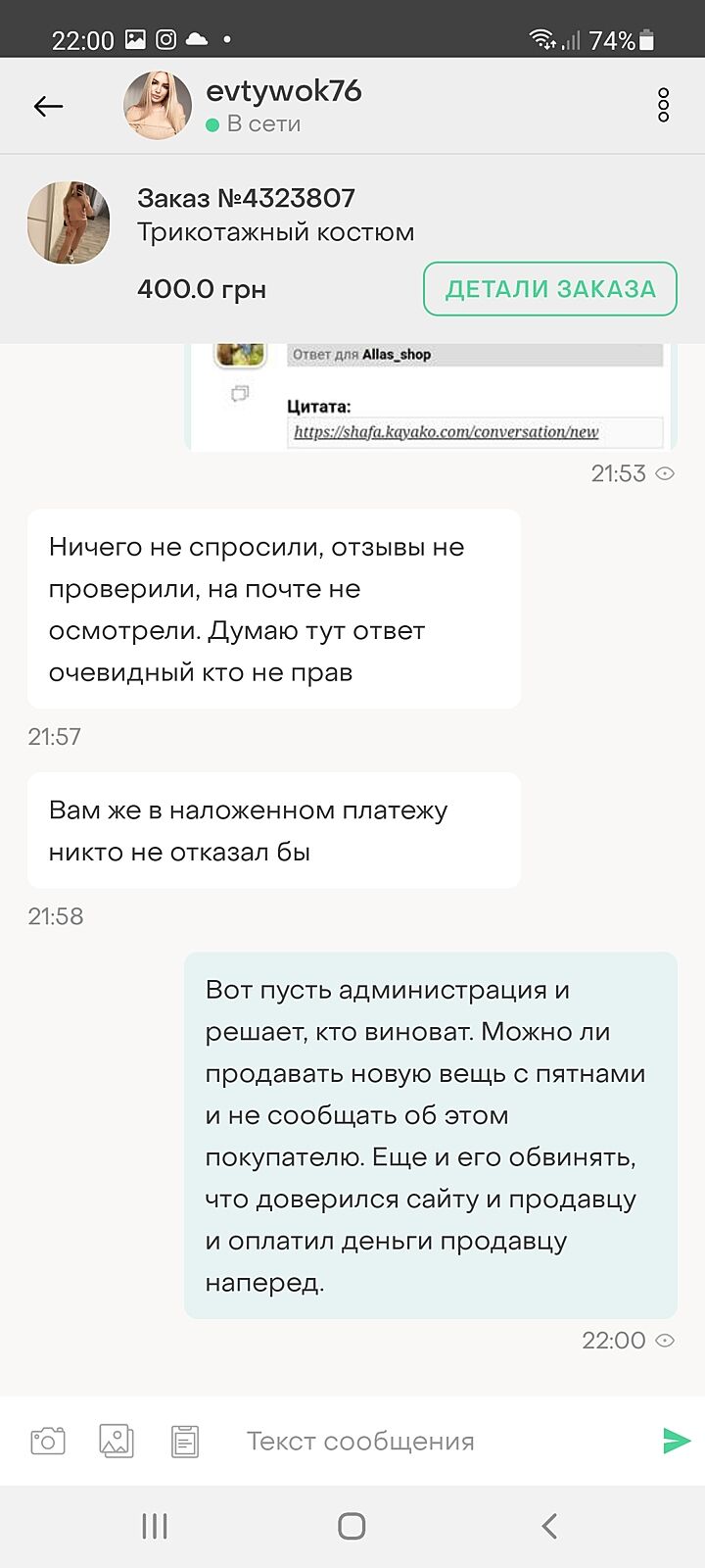 Купила на шафе два новых вязанных костюма. Сегодня получила, а на одном из них на штанах пятна, я пишу продавцу об этом, прошу вернуть его, скидываю фото, а она не отвечает. Я ей звоню, а она говорит, так я его тоже таким купила, типа, это для меня будет аргумент, и поэтому она его за 400 грн.и продавала. Я ей говорю, что нужно было об этих дефектах мне сказать, а я бы уже решала покупать или нет. Мне с пятнами и за 100 грн.он не нужен. А она бросила трубку и внесла меня в черный список. Сейчас только обратила внимание, что у нее отзывав на шафе нет, но она там уже год.