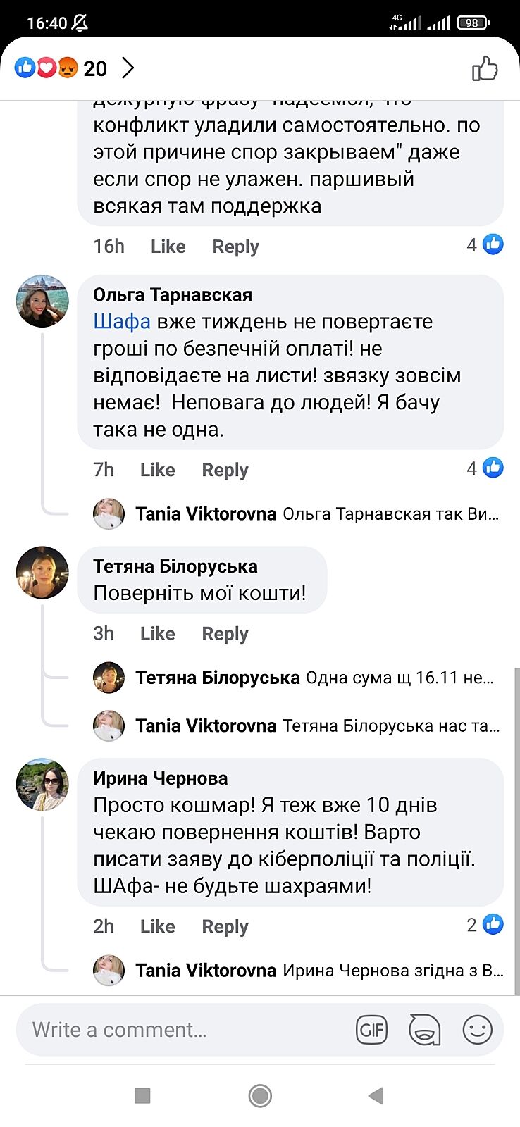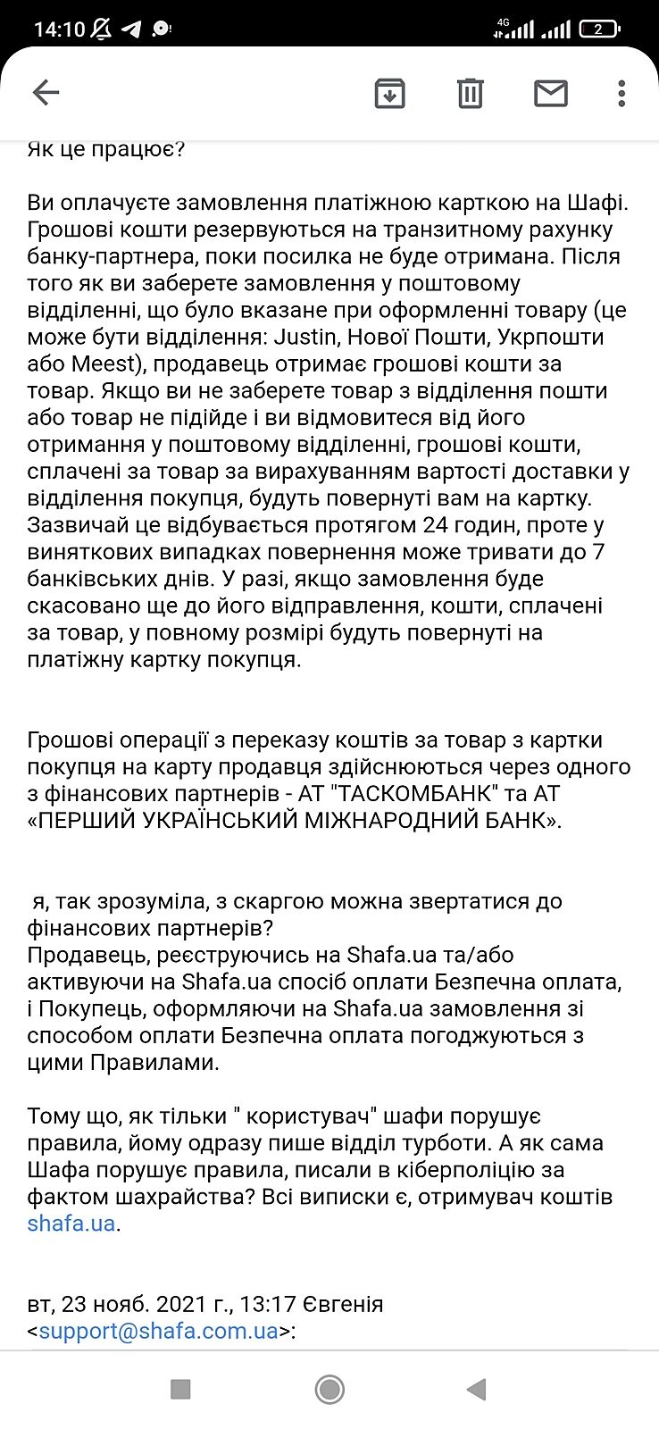 Это пусть уже прокуратура разбирается.Эта машина действует медленно ,но неотвратимо.Похоже,Шафа в принципе собиралась закрываться.Для начала напишу в киберполицию.Через пару дней отправлю заказное с уведомлением в прокуратуру,пока Киева.Хотя,можно и в генеральную,но это месяца 2 на ответ,не меньше