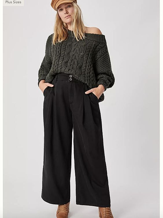 В данном случае необходимо выбрать свободные брюки-палаццо. И за счет визуальных объемов подчеркнется талия.
