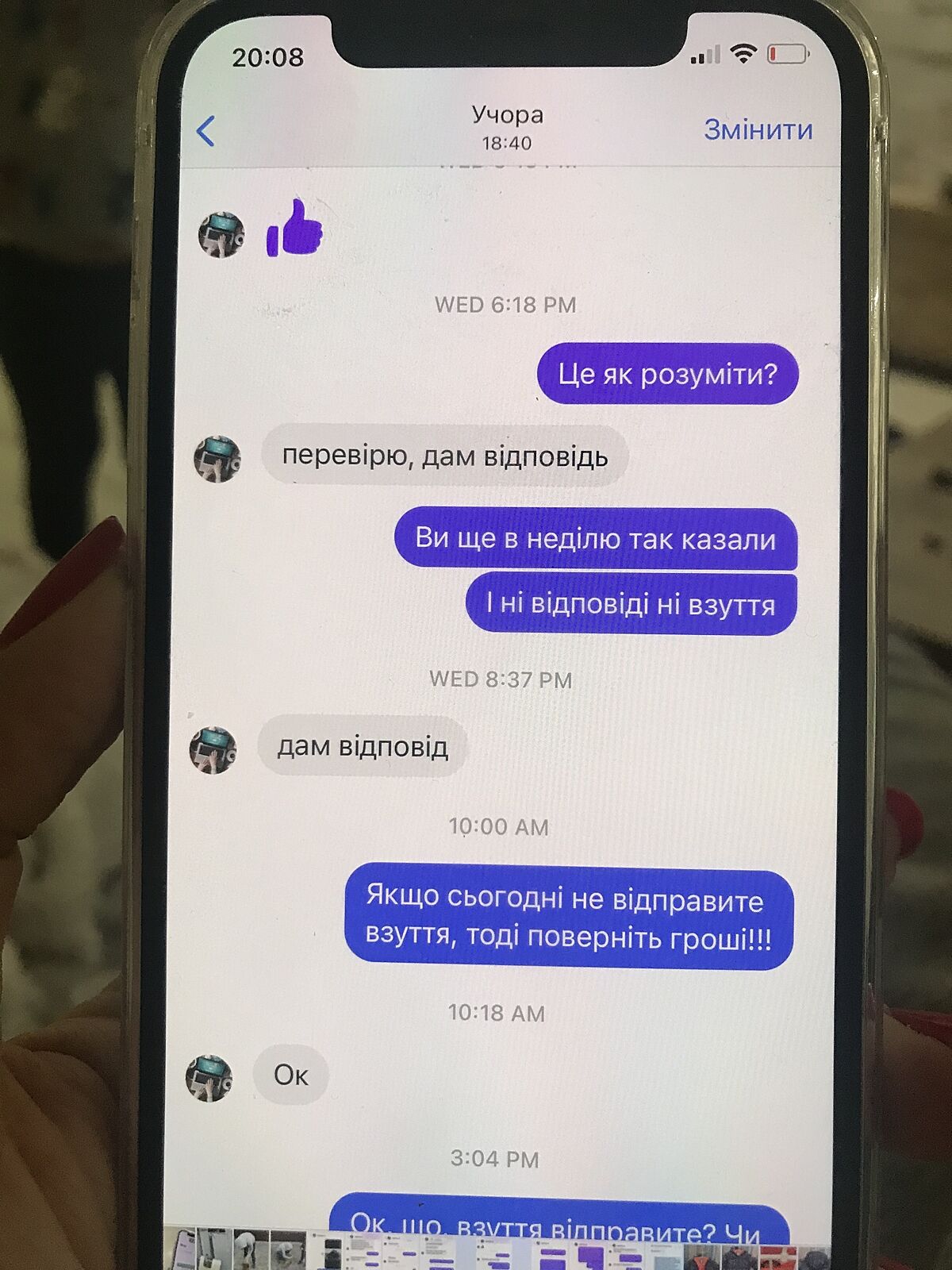 Дівчата, допоможіть, куди звернутися, 26.11.21 зробила замовлення на платформі Фейсбук в одному із магазинів, замовила чоловіче взуття з повною передплатою( тому що вже в них замовляла 1 пару, прийшло швидко і якісне), ціна 1650 грн, до сьогодні не отримала, скрін переписки скину нижче, а сьогодні взагалі заблокували мене