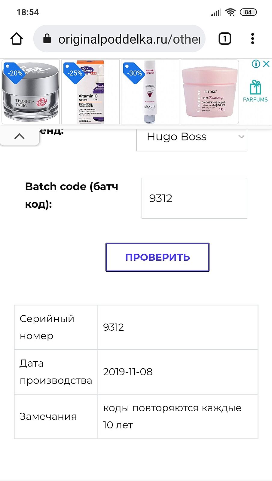 Буду ждать скидку в Брокарде, но ради интереса заказала Босс Оранж 30 мл на парфумс, приду в Джастин забирать и на месте пробью батч код с коробки