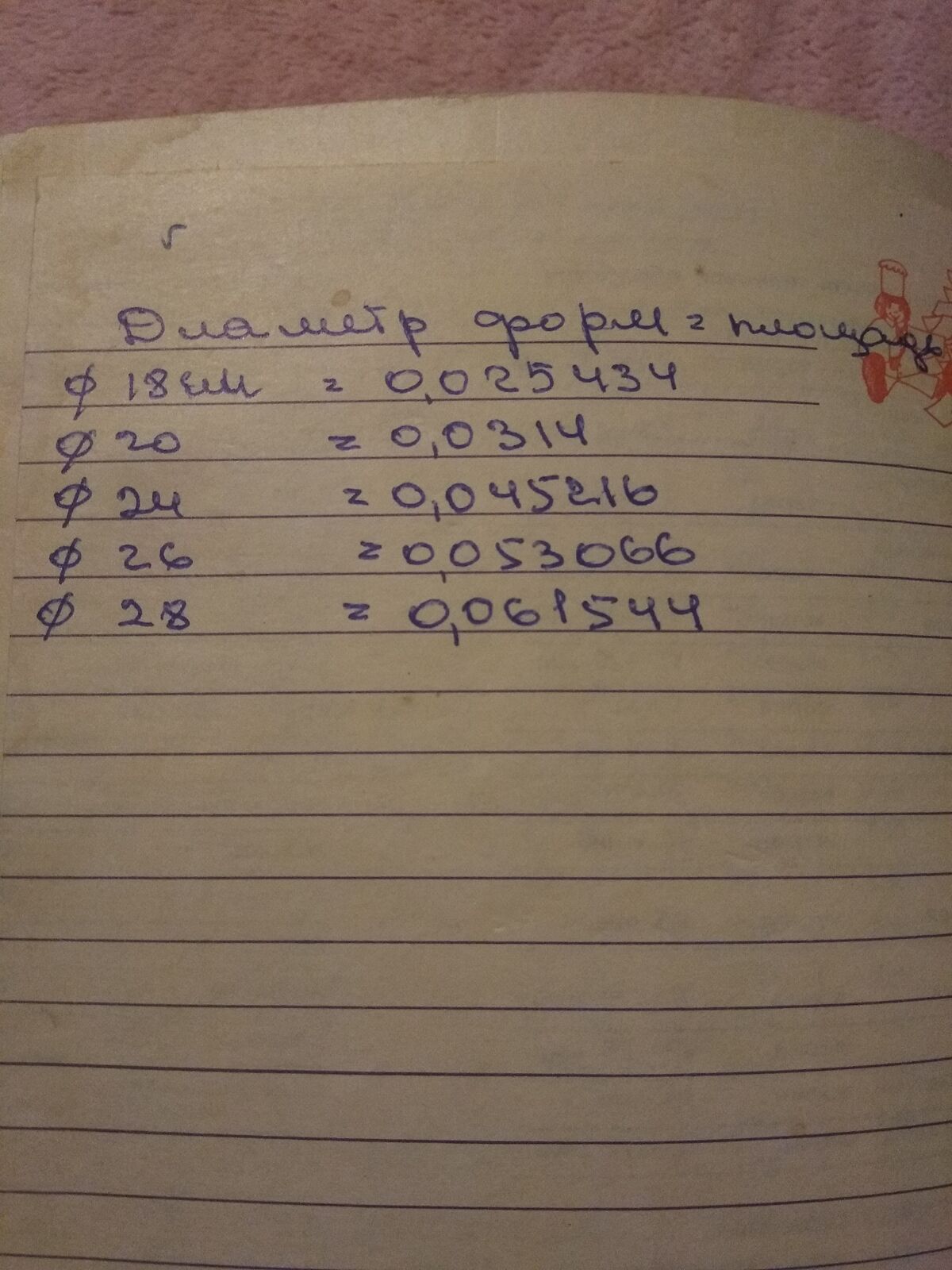 Площадь круга πr2, если диаметр 20 см, то радиус = 10 см. Получается 3,14*10 в квадрате , это никак не выйдет 0.0314 как в вашей табличке