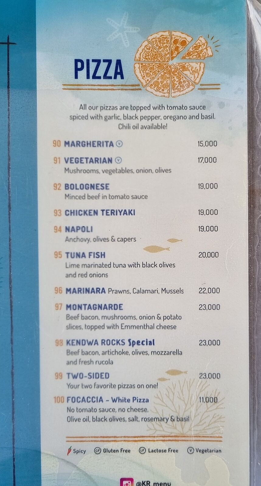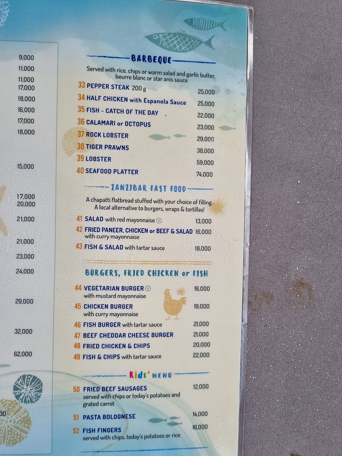 Есть супы, пицца, бургеры, ну и разные блюда с морепродуктами (креветки, кальмары, лобстеры, тунец) Очень вкусный карпаччо из тунца. Цены от 7000- 10000 на супчики и выше.