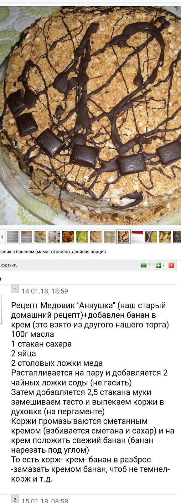 Самый вкусный мой медовик с бананом, промазываем сметанным кремом, 1-2 банана режем кружочками под углом и кладём его на сметанный крем и сверху сметану, чтоб не темнел и следующий корж. Банан потом пропитывает медовик и выходит очень вкусно