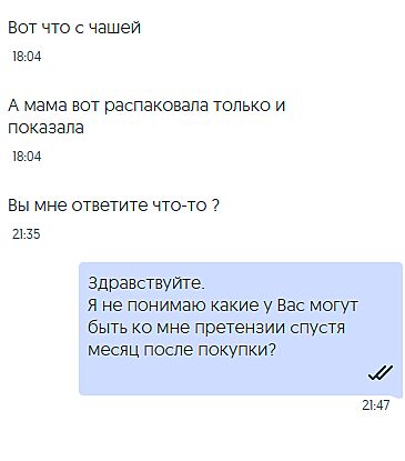 мне не нужна эта чаша, но я реально не понимаю как можно обращаться с подобными претензиями спустя месяц после покупки еще и настаивать на ответе?