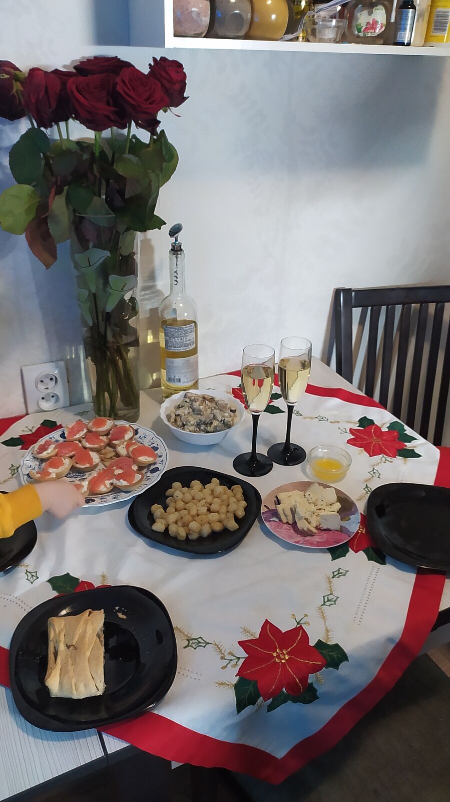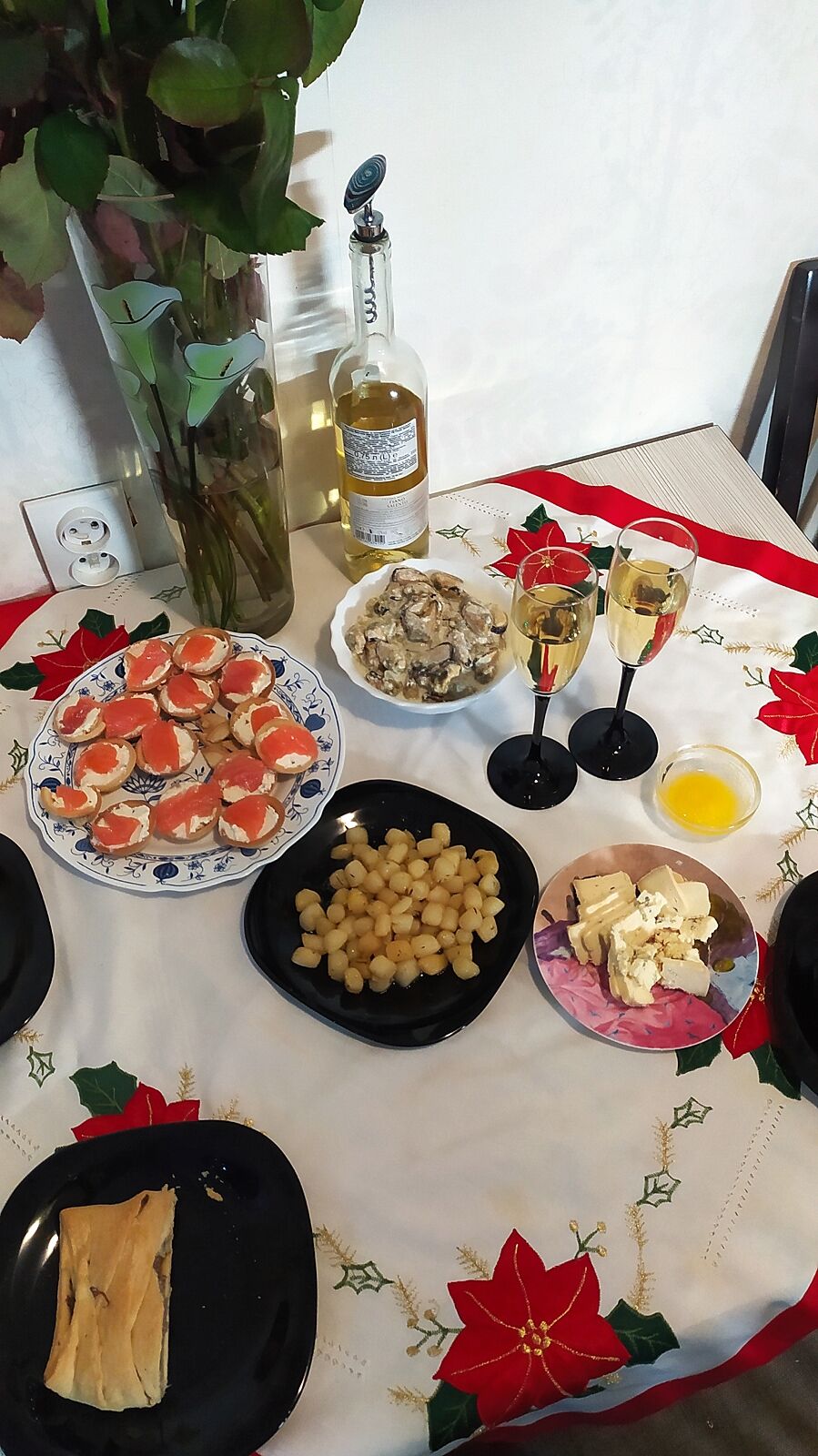 А сколько человек? Бокалов два, а бутеров на десятерых хватит. И что посередине стола в тарелке? Оливки?