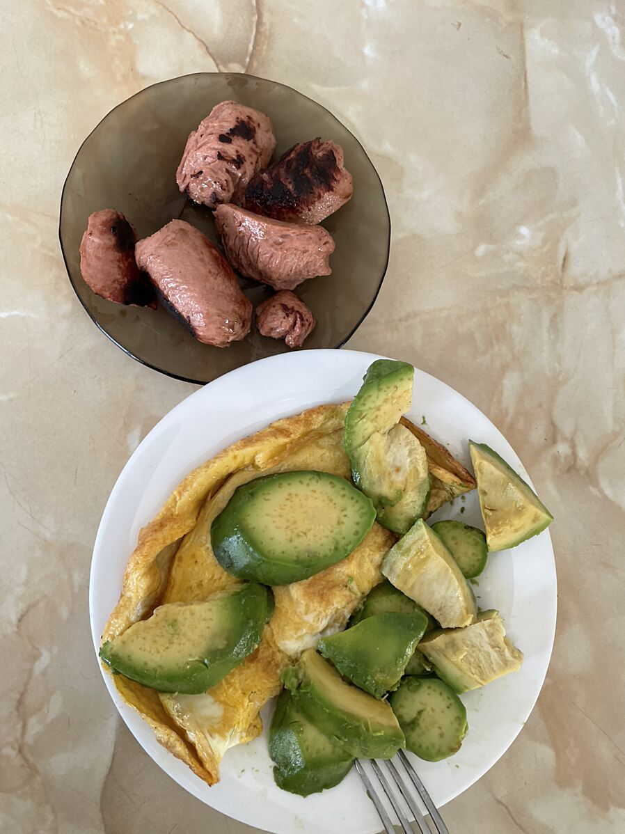 Жареные сосиски, яйцо на масле сливочном +оливковом и авокадо))))