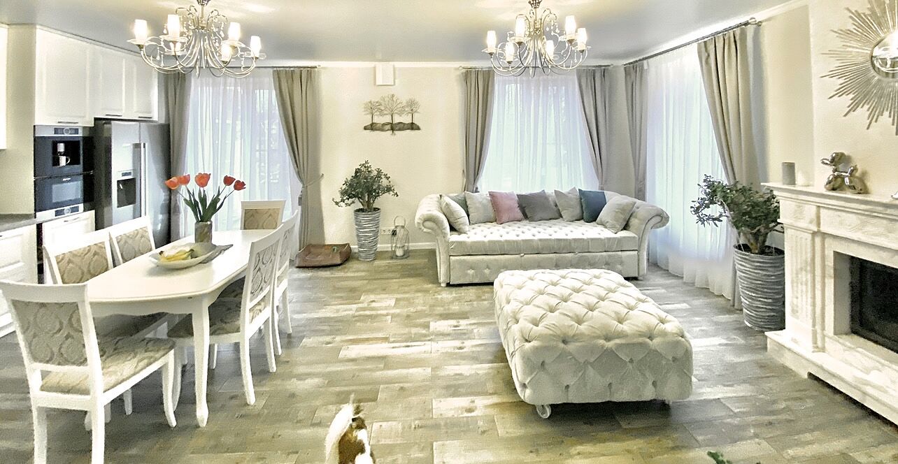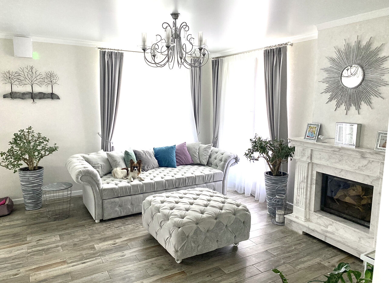 У нас такой диван. Правда на фото потолки как глянец, но на самом деле -сатиновые они у меня