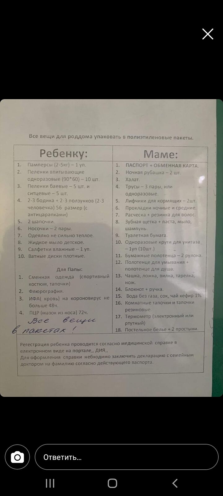 Ребенку: шапочка 2х хватит, носочки 2пары; вместо ползунков и сорочки - человечки по 2шт. тонких и теплых 56р.; крем,присыпка,масло,ватные палочки не нужны; обязательно большую упаковку влажных салфеток. Пригодилась очень соска когда надо было отлучиться и ребенок был с бабушкой.