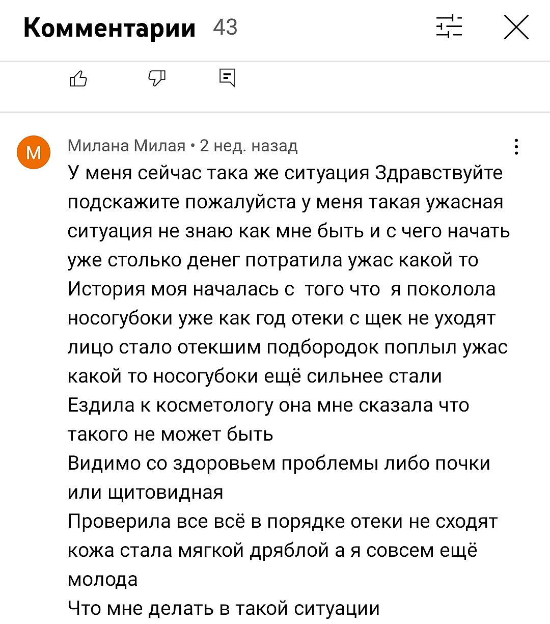 Мужчина-абьюзер сказал ей, что она стареет. Она начала колоть сначала носогубки и дальше - больше. 10 лет ходила колоться. Потом косметолог обнаружила под веком растекший гель под кожей и предложила его расстворить неким препаратом. У нее стала иссыхать кожа. Препарат уничтожал вместе с гелем и подкожный жир. Сейчас она еще и зрение теряет.