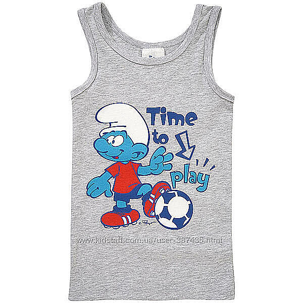 Смурфы хорошие! Две майки светло-серого цвета с крапинками и крупным футболистским принтом «Смурфики» спереди и светло-голубыми футболками с изображением футбола и мотивом «Смурфики» по всей поверхности. Каждая из них с окантовкой на концах из отличного, слегка эластичного хлопка.