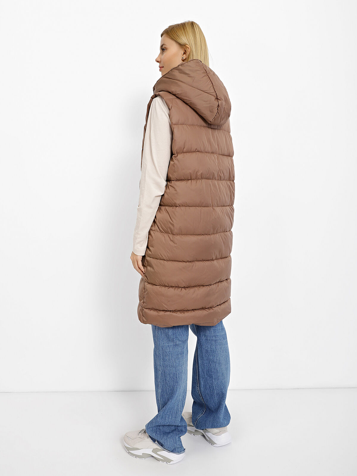 Свободный крой с заниженной линией плеч, длинными широкими рукавами и разрезами по бокам внизу.