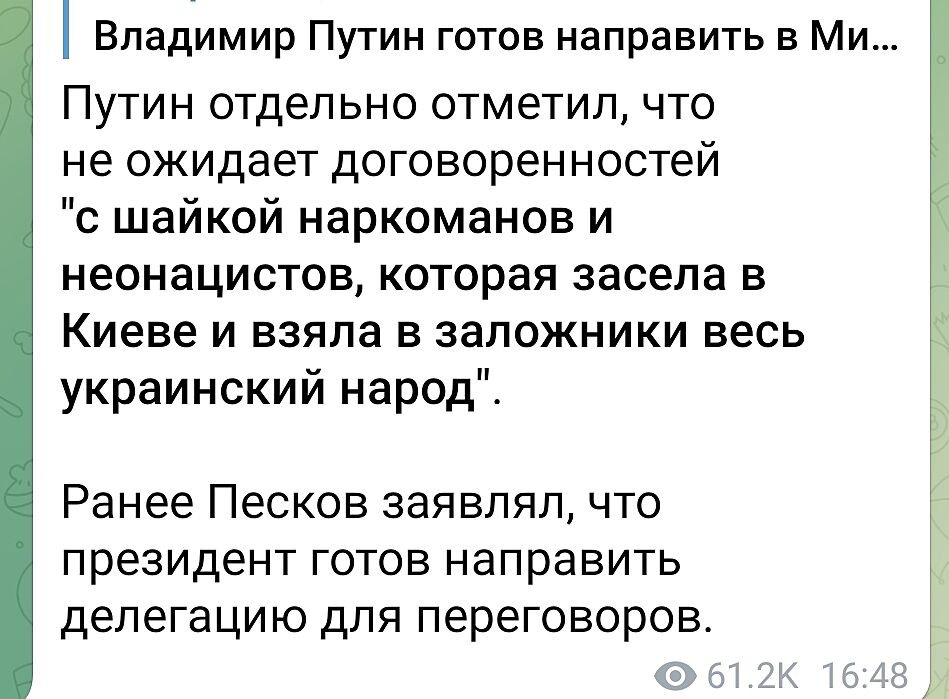 Тем временем сам Путин, выступая на Совбезе РФ, заявил, что не ожидает договоренностей с ’шайкой наркоманов и неонацистов, которая засела в Киеве и взяла в заложники весь украинский народ’.