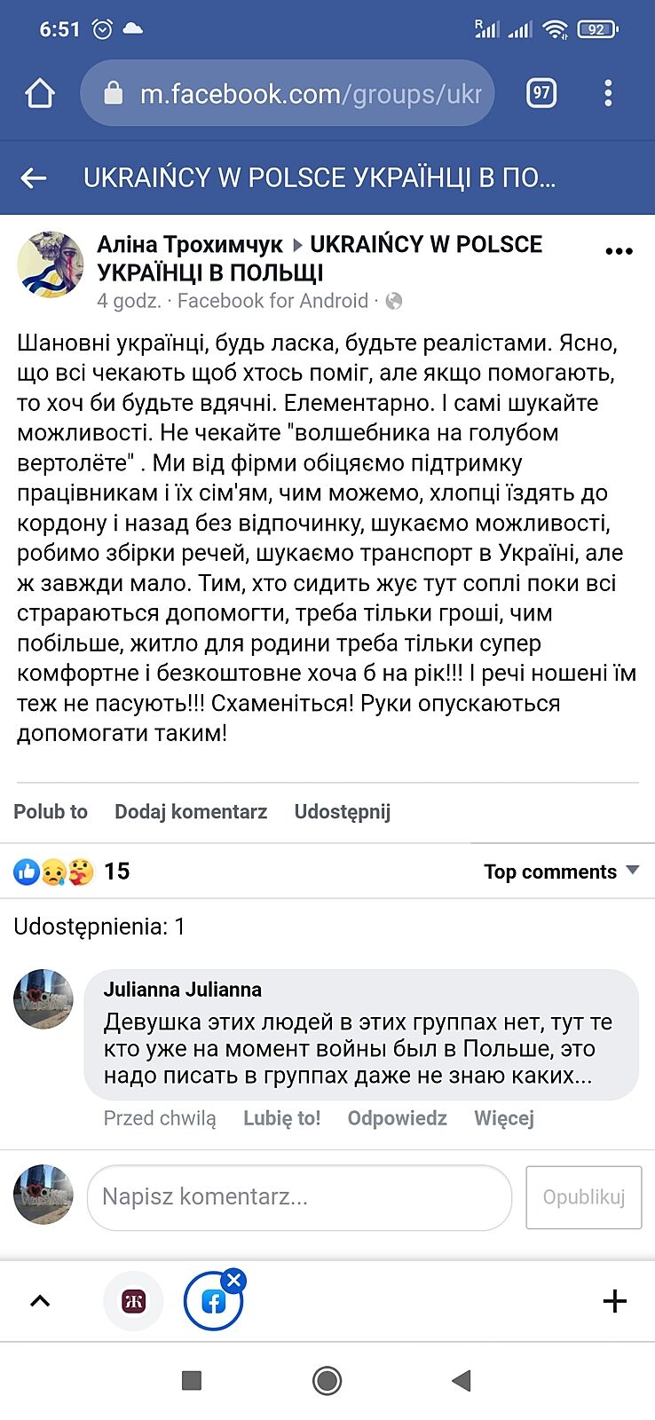 Все помогают польское население, но наши хотят много новое...у волонтеров начинается паника, вот скрин поста