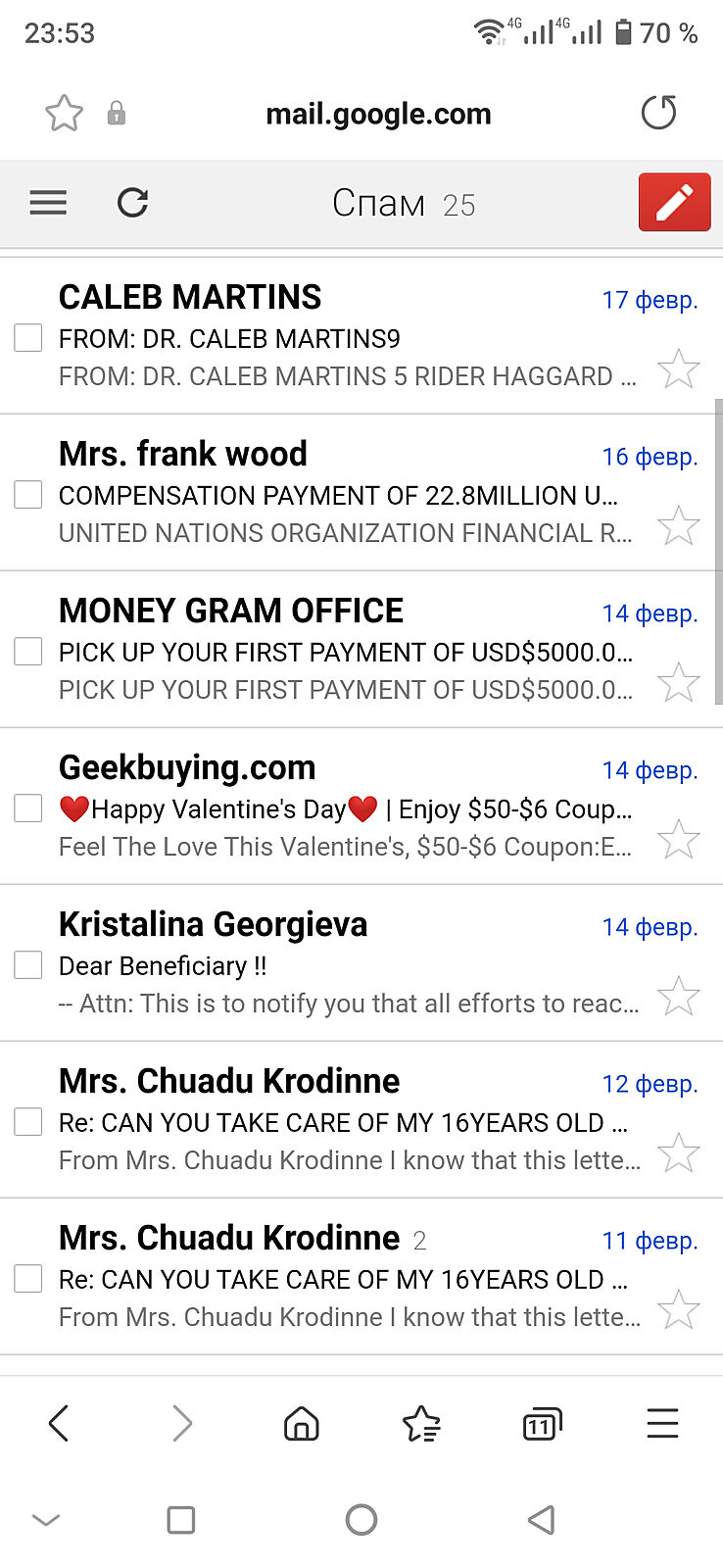 У меня таких писем на почте вагон и маленькая тележка.
