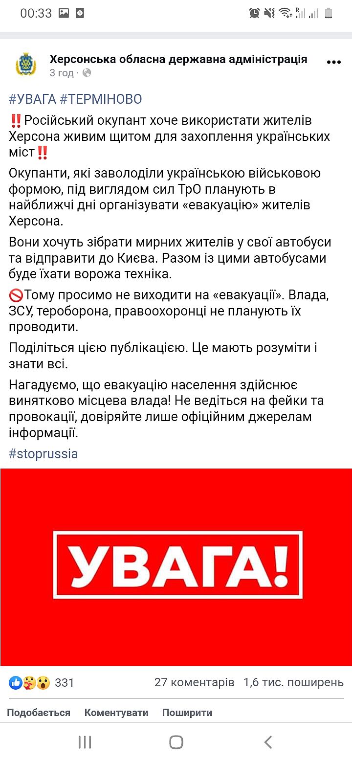 Сьогодні неоднарозово публікується інформація щодо можливих провакацій з використанням евакуації мирного населення (Київська обл, Херсонська обл). Прошу поширити інформацію.