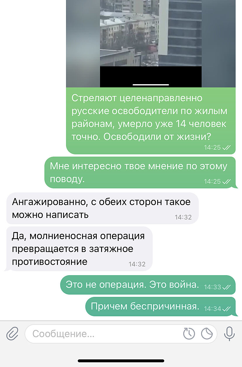 У меня родственники в Москве. Наверное уже бывшие. Никакими доводами я не смогла к ним достучаться. На все ответы типа: «раша хочет мира для Украины, мы сами по себе бомбим, у нас Гражданская война, они нас спасают, по мирным не стреляют и т. д.». И это говорит мне умный человек, который создал онлайн-банкинг в ВТБ и занимает там высокую должность. Но все мои доводы бесполезны. Их реально зомбировали.