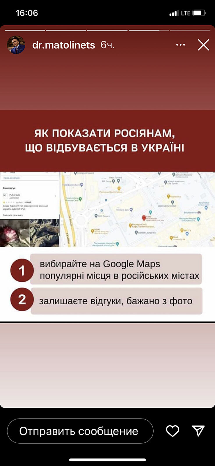 МАКСИМАЛЬНИЙ РЕПОСТ ДРУЗІ УВАГА: Необхідно почати виходити на простих і не простих громадян РФ Фішка є наступна. Заходимо у Гугл карти і знаходимо Москва, Пітер, Новосибірськ…. Коротше, будь-які міста РФ. Натискаєм на будь-яке популярне місце на цій карті (кафе, ресторан, магазин, автосервіс….але популярне). Далі, проходити в коментарі, поставивши цьому місцю хорошу оцінку (там зірочки, як правило). Отримуєте доступ до коментарів, які читают, звичайно, місцеві жителі і гості міста…Зрозуміли? Тексти - то вже на ваш розсуд. Але, думаю, вони повинні містити не тільки заклики, але й конкретні пропозиції що їм робити розуміючи , що відбувається!!! Перевірено , це працює і це можуть робити всі включаючи підлітків.