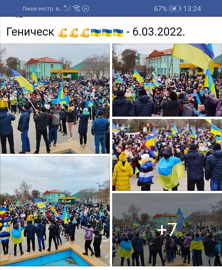 Сьогодні на основній площі Генічеську біля фонтану жителі міста зібрались на мирний мітинг проти окупації міста. І це те місто, що славилось своїм совкодрочінням, але там повно молоді, навіть, дітей. Мій чоловік і старший син 13 років теж там, всі хочуть жити в Україні! Пишаюсь своїм містом, пишаюсь українцями!
