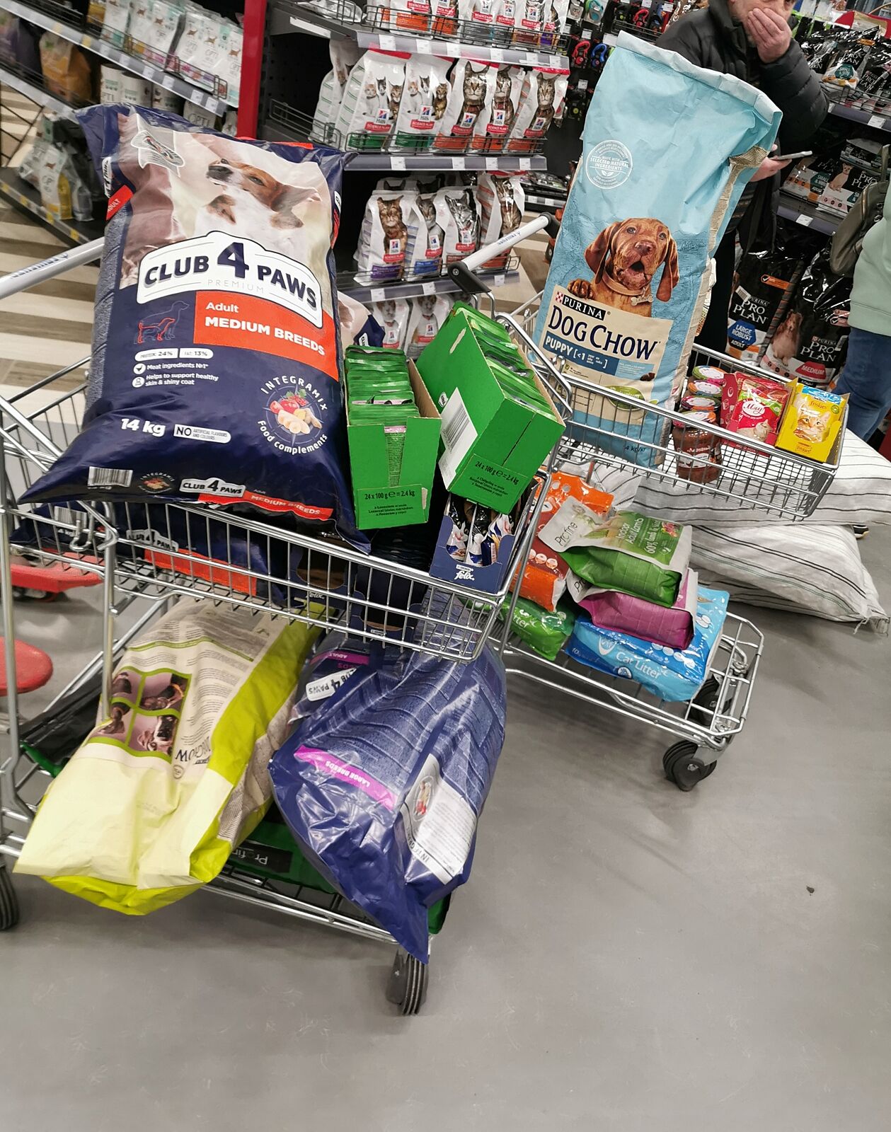 В крупных магазинах есть все, включая свежее мясо. Я была в Метро на Петровке и в Эпицентре в Блокбастере. Чтоб вы понимали, как я выезжала оттуда. Две телеги из Метро и две из Эпика. Покупали на всю округу корма, еду, ещё аптеки обнесли