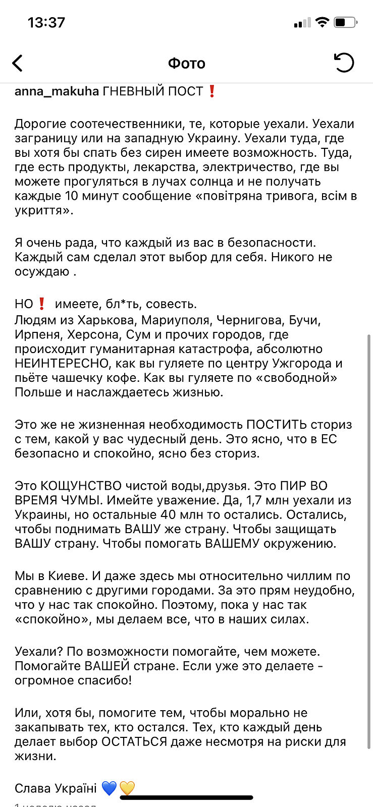 Не разжигаю, просто интересно ваше мнение. Заметила, что те, кто в безопасности, но из Украины, не постят фото с прогулками и тд. Та малая часть из рф, что осталась в инстаграм, постят «счастливые будни», через впн наверное.