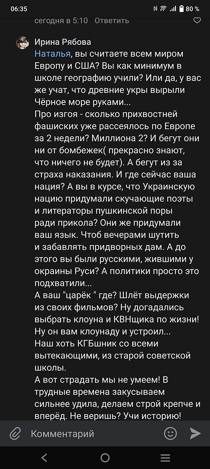 Комменты по всех группах нещадно трут-на видео и фото их "вояк", естественно,пишут,что это все фейк и монтаж. Правда,некоторых сильно впечатлила пресс-конференция "сбитых лётчиков эрэфии". Оказалось,там был какой-то известный у них,они его узнали . Разрушенные города-для них фейк,убитые мирные жители-ложь и т.д. Я сначала страшно злилась и пыталась вправить им мозги. Но после подобных комментариев ( это один из многих,они там все,как под копирку пишут) поняла,что там унитаз вместо мозга. А унитазы я вправлять не умею)))