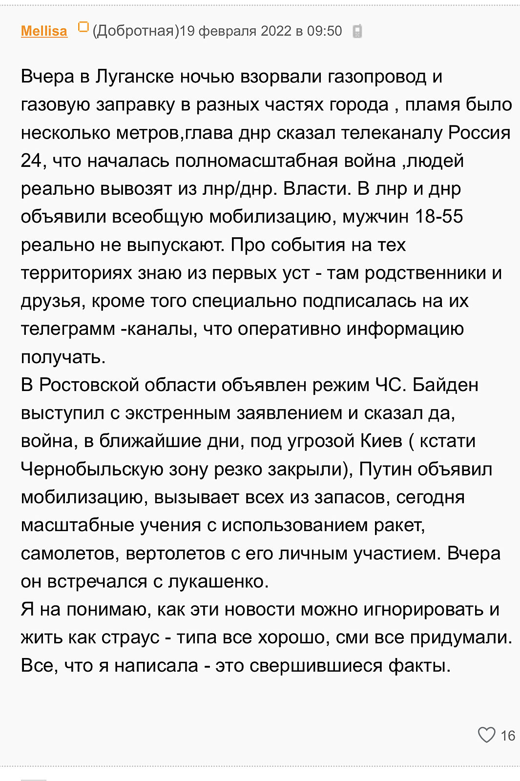 Мы с мужем не верили, но моя сестра примерно дней за 10 уже начала говорить что нужно уезжать, будет война…