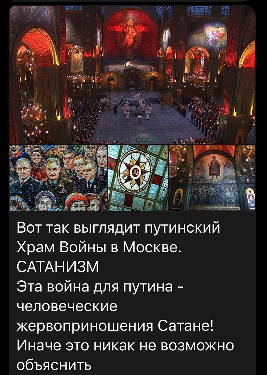 Мне кажется, что он какой-то сатанист. Вместе со своей сворой. Даже этот храм войны снаружи выглядит стрёмно. И разве действительно верующий человек, каким он прикидывается, будет строить храм во имя тех, кто скольким людям по миру принёс горя?