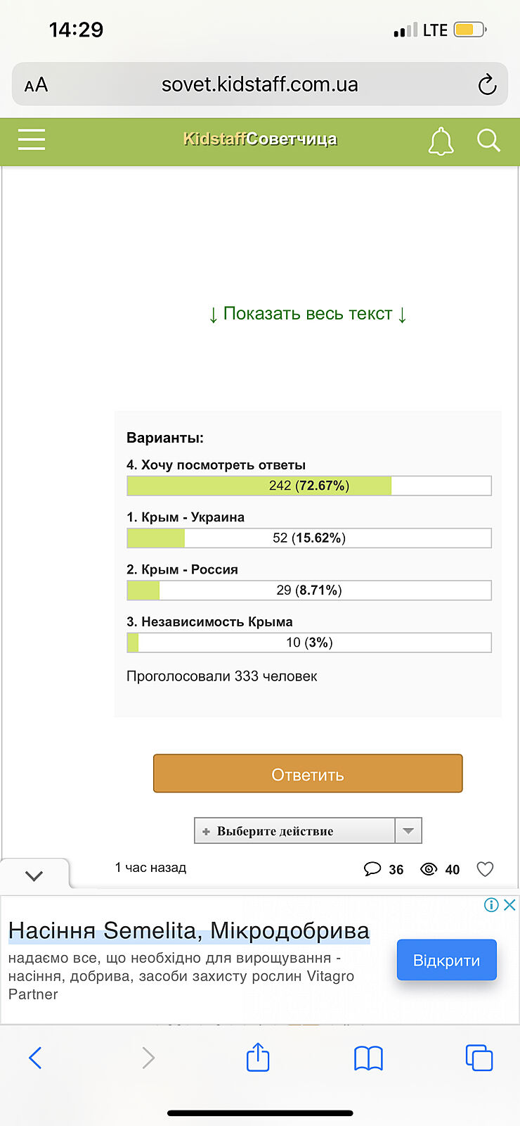 Вот ответ моей двоюродной сестры-крымчанки моему мужу, после которого и голосовать не нужно: Оскорбляя мою Великую страну🇷🇺, ты оскорбляеш меня. Каких только грязных слов я за это время от вас не слышала. Ваша ненависть зашкаливает! Предупреждаю! Ещё раз пришлешь гадости я скину твой тел. ’Вежливым людям’ .Тебя найдут и научат уважительно говорить о моей Великой стране!!! А пока учи Гимн России стоя!🇷🇺🇷🇺🇷🇺