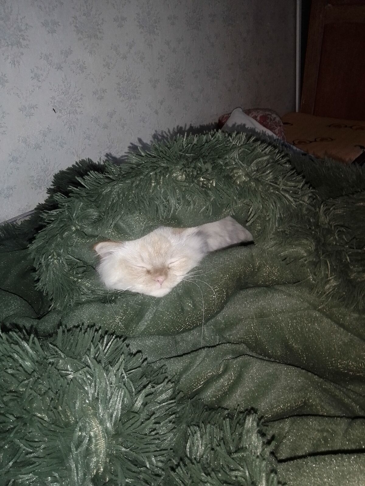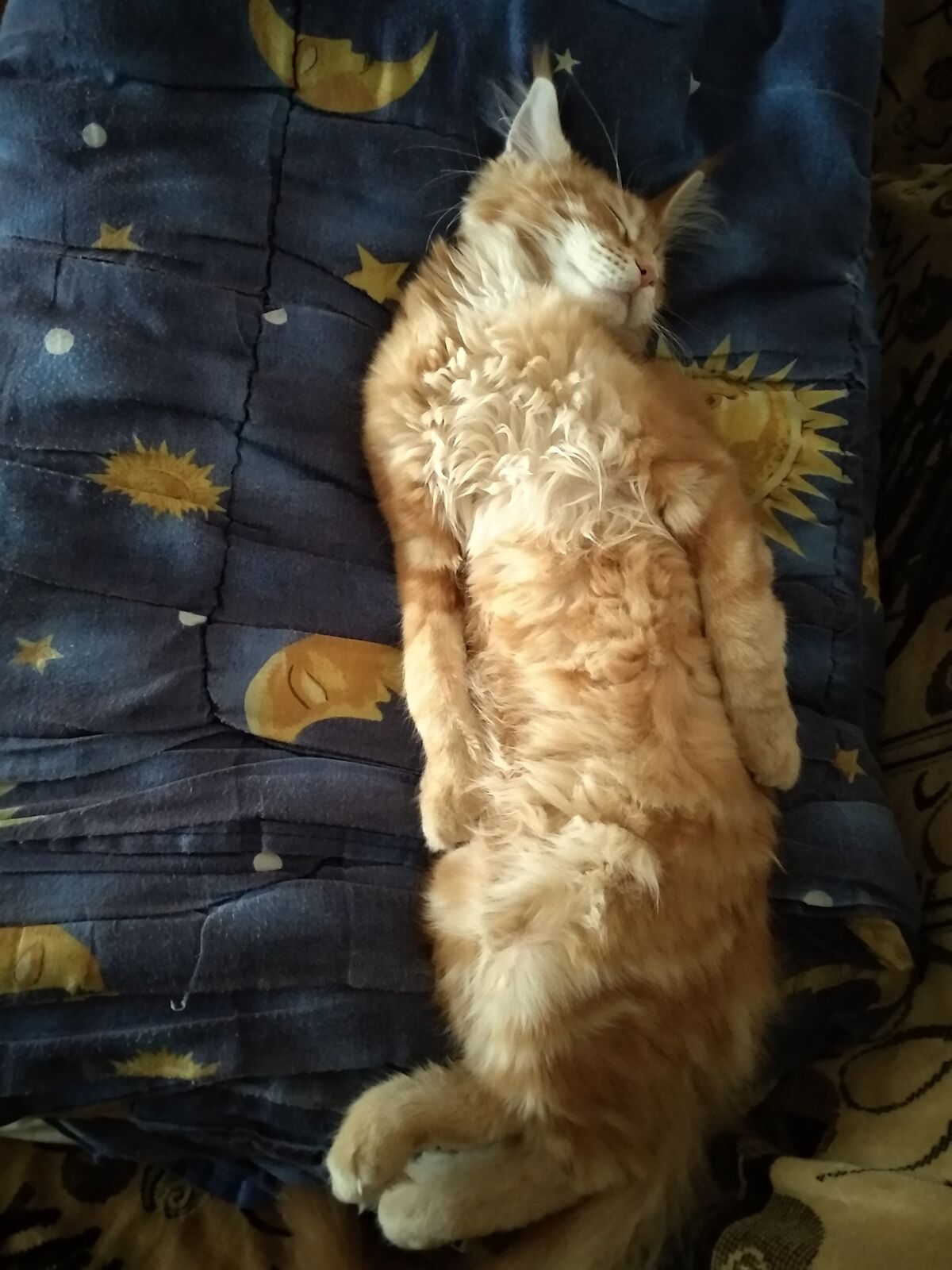 Дремлет на диване, передними лапками касается моей левой ноги. Очень приятно)