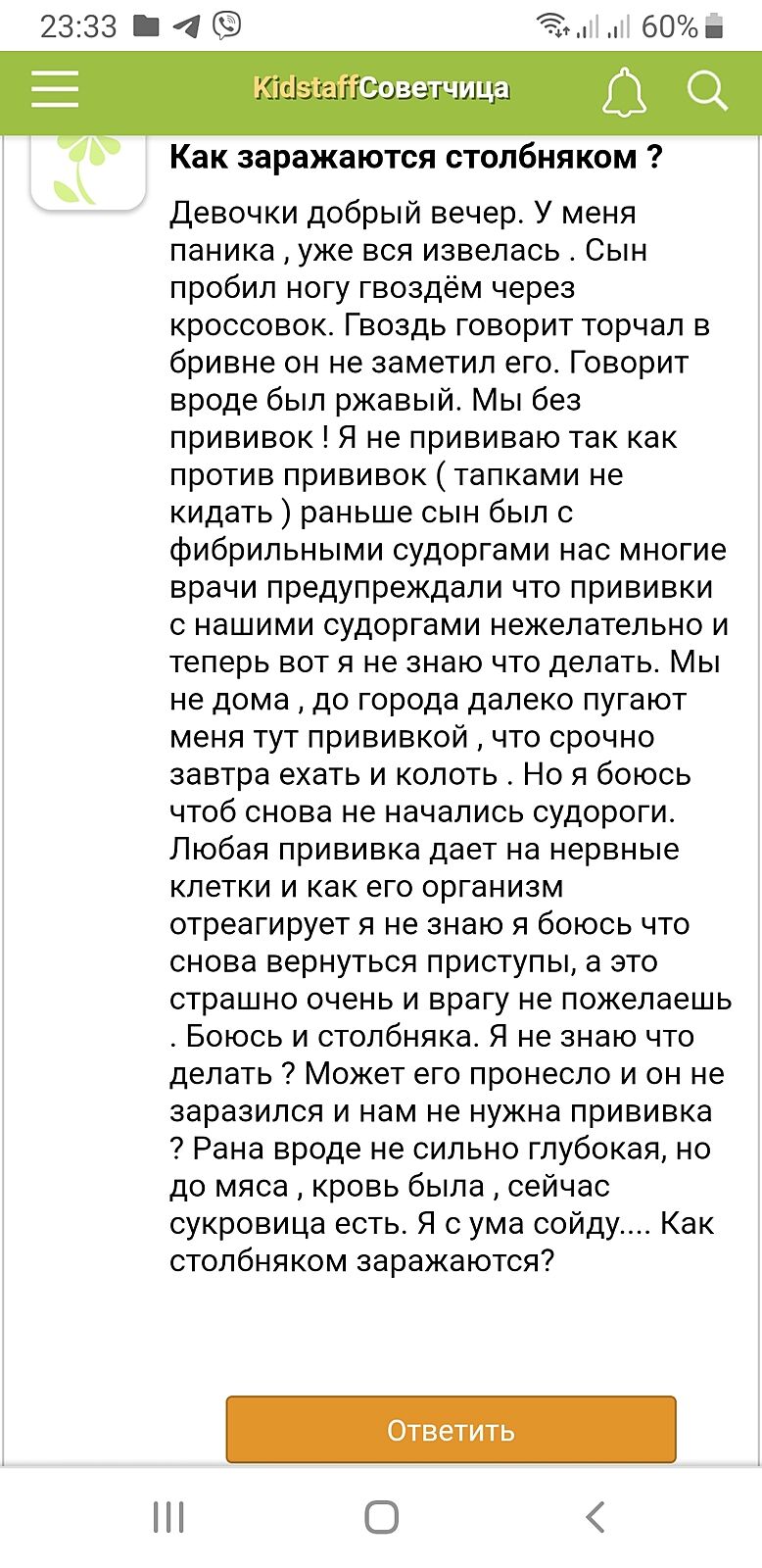 У нас нет ни одной прививки. Нам в сентябре будет уже 10 лет . Я противник прививок и мы в прошлом с судоргами и аллергики . Теперь вот случилось ЧП и мне врачи выедают мозг .....я боюсь и прививки и того что я ж не знаю какой гвоздь был . Короче 2я бессоная ночь из-за переживания я аж похудела за 2 дня
