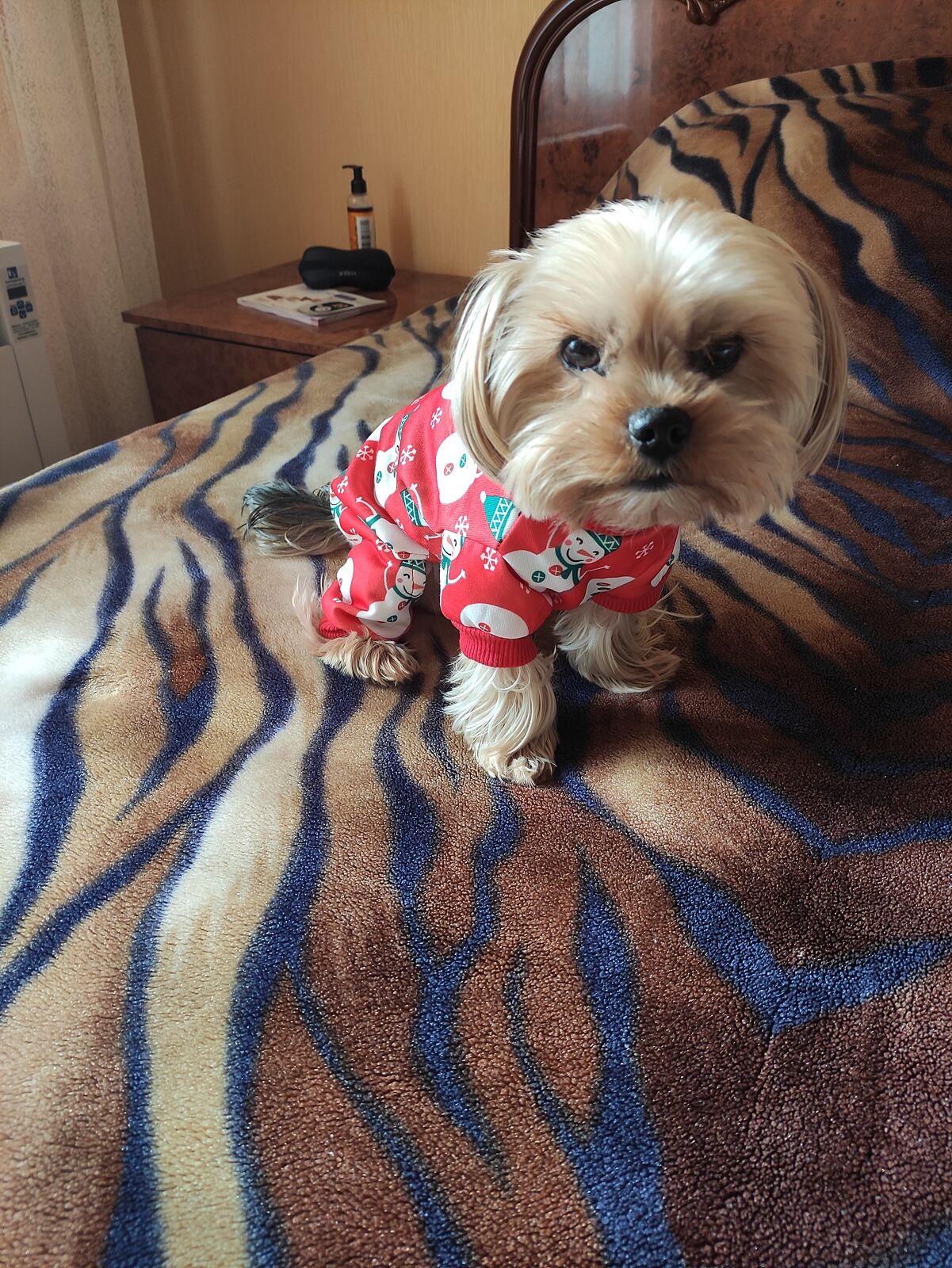 У моего только курточка на холодную осень и зиму. Он же собачка, зачем ему одежка, если на улице тепло