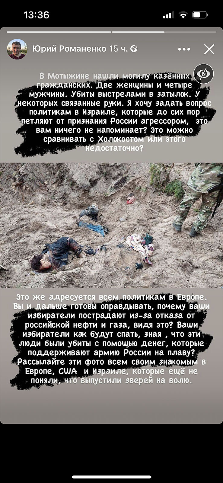 Я сейчас забанена на росресурсах. Сохраняю скрины с Бучи, Житомирской трассы все те ужасы, что они творили с мирными людьми и буду распространять потом. Чтоб все это видели, чтоб каждое фото осталось в инете и напоминало миру, кто такие русские.