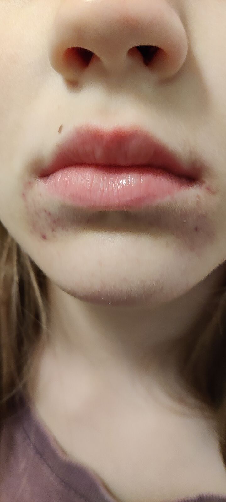 Я такое видела как кровоподтёк, когда ребенок пытался колпачком от дезика губы сделать крупнее, пухлее