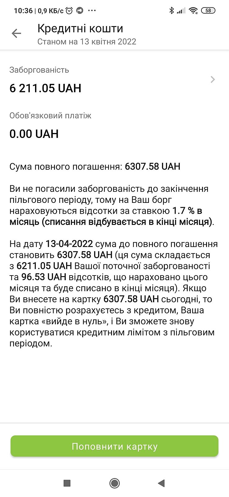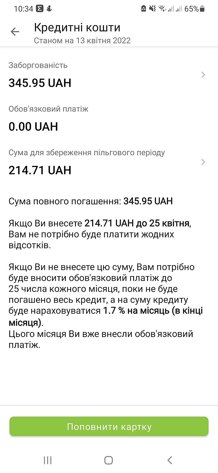 В мене приват пише ,що буде нараховувати 1,7% на кредитні кошти кожного місця до повного погашення заборгованості.